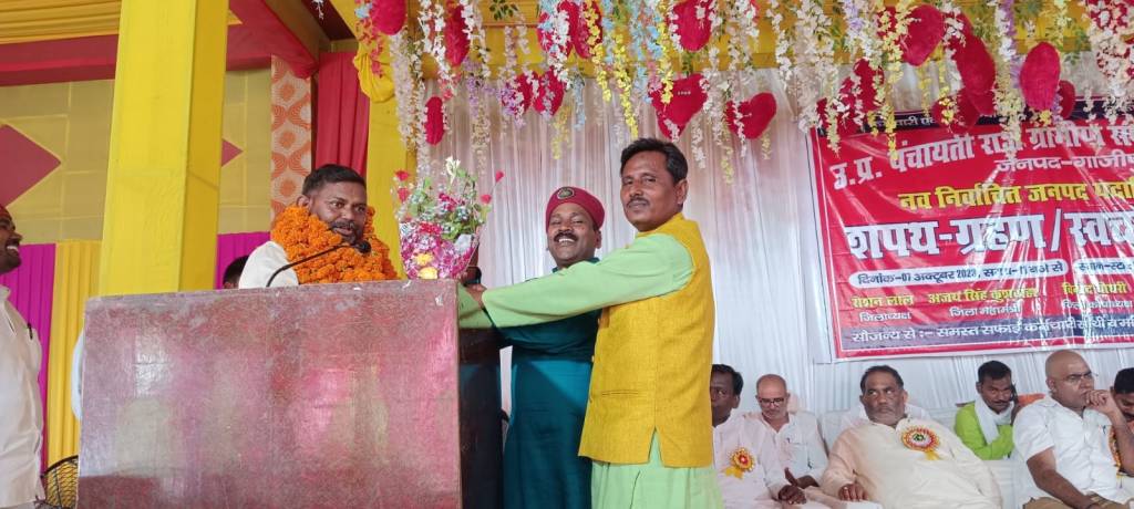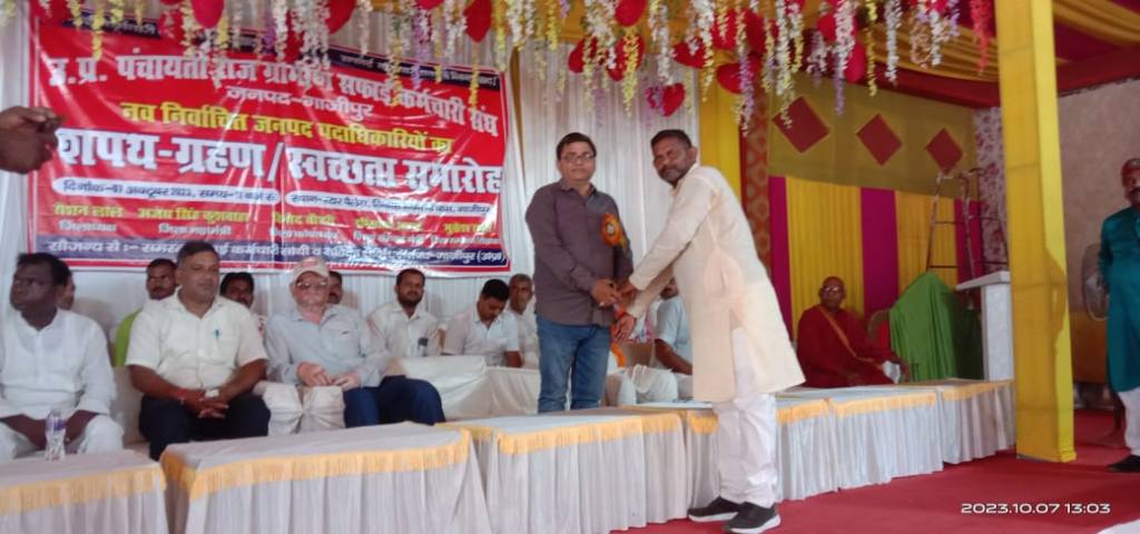 गाज़ीपुर।शनिवार को उत्तर प्रदेश पंचायती राज ग्रामीण सफाई कर्मचारी संघ के नव निर्वाचित जिला पदाधिकारियों का शपथ ग्रहण और स्वच्छता समारोह स्टार पैलेस खजूरिया में सम्पन्न हुआ। इस दौरान जिलाध्यक्ष के पद पर रोशन लाल, जिला महामंत्री अजय सिंह, जिला कोषाध्यक्ष विनोद चौधरी, जिला संगठन मंत्री, इम्तियाज अहमद, जिला संप्रेक्षक मुकेश कुमार रावत ने अपने अपने पद और गोपनीयता की शपथ लिया।