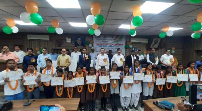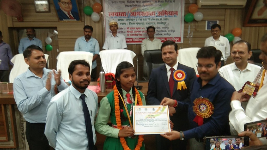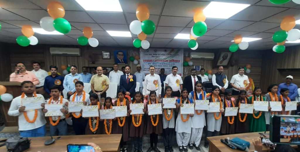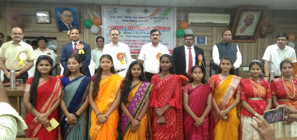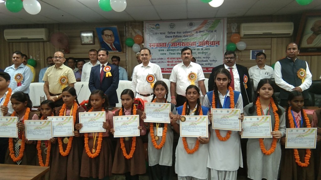 गाजीपुर। राज्य विधिक सेवा प्राधिकरण लखनऊ के द्वारा निर्देश पर स्वच्छता जागरूकता अभियान 2 अक्टूबर से 8 अक्टूबर 2023 के अन्तर्गत निबन्ध एवं चित्रकला प्रतियोगिता का आयोजन किया गया जिसमें प्राथमिक स्तर, माध्यमिक स्तर एवं उच्च स्तर के प्रतिभागियों ने प्रतिभाग किया। प्रतिभागियों में प्रथम स्थान, द्वितीय स्थान व तृतीय स्थान प्राप्त प्रतिभागियों को पुरस्कृत करने हेतु सोमवार को जिला पंचायत सभागार में एक पुरस्कार वितरण समारोह का आयोजन किया गया। जिसमें जनपद न्यायाधीश/अध्यक्ष, जिला विधिक सेवा प्राधिकरण, अपर जनपद न्यायाधीश चन्द्र प्रकाश तिवारी, अपर जनपद न्यायाधीश संजय कुमार यादव प्रथम, शरद कुमार चौधरी मुख्य न्यायिक दण्डाधिकारी एवं दीपेन्द्र कुमार गुप्ता पूर्णकालिक सचिव जिला विधिक सेवा प्राधिकरण, गाजीपुर, ए0डी0एम अरूण कुमार, जिला विद्यालय निरीक्षक, जिला बेसिक शिक्ष अधिकारी, खण्ड शिक्षाधिकारी एवं अन्य द्वारा प्रतिभाग किया गया।