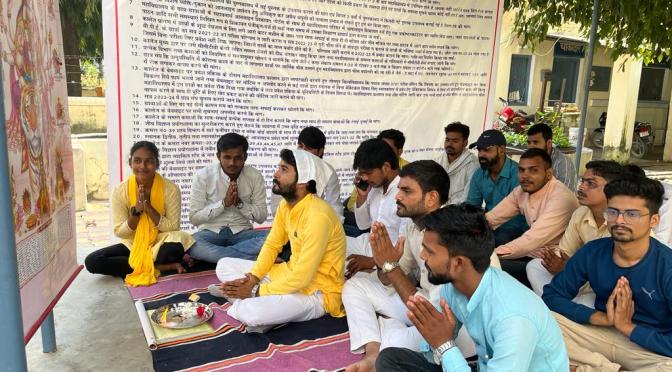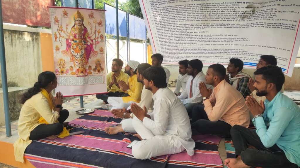 ग़ाज़ीपुर।रविवार को पीजी कॉलेज के प्रांगण में छात्रों ने चौथे दिन भी अनिश्चितकालीन धरना जारी रखा। सभी छात्रों ने नवरात्रि में धरना स्थल पर मां दुर्गा कि तस्वीर रखकर पूजन-अर्चन के साथ माता रानी से महाविद्यालय प्रशासन के सद्बुद्धि के लिए प्रार्थना किया। बता दें कि छात्र विगत् चार दिनों से 32 सूत्रीय मांगों के संबंध में धरना दे रहे हैं ।