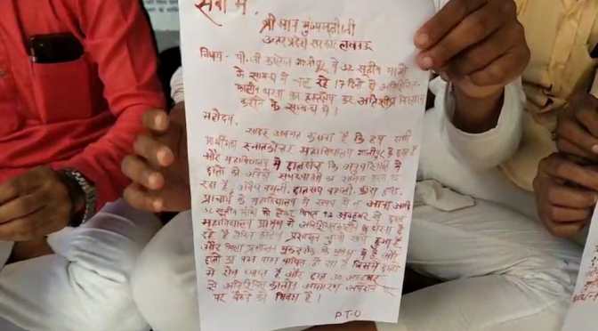 गाजीपुर। पीजी कॉलेज के प्रांगण में छात्रों ने सत्रहवें दिन शनिवार को भी अनिश्चितकालीन धरना जारी रखा। छात्रों ने आक्रोशित होकर अपने खून से राज्यपाल व मुख्यमंत्री के नाम संबोधित पत्र लिखा। पूर्व छात्रसंघ उपाध्यक्ष दीपक उपाध्याय ने कहा कि छात्रों द्वारा छात्रहित में उठाई गई मांग कि महाविद्यालय प्रशासन द्वारा बार-बार उपेक्षा करने पर आक्रोशित धरनारत् छात्रों ने अपने खून से कुलाधिपति/राज्यपाल व मुख्यमंत्री के नाम संबोधित पत्र में अपने साथ महाविद्यालय में हो रहे खुलेआम शोषण, अत्याचार व अवैध वसूली तथा छात्रसंघ बहाली सहित 32 सूत्रीय मांगों का दुखड़ा लिखकर डाक के माध्यम से पत्र भेजकर जल्द से जल्द समस्याओं के निस्तारण कि मांग की। छात्र नेता निखिल राज भारती ने कहा कि महाविद्यालय प्रशासन तमाम अनियमितता कर रहा है और जिला प्रशासन उसे सहयोग कर रहा है जिस वजह से वे छात्रों के साथ हिटलरशाही रवैया अपनाया हुये है जिसे छात्र कदापि बर्दाश्त नहीं करेंगे। छात्र नेता आकाश चौधरी ने कहा कि छात्रों कि सभी मांगे जायज है और जल्द से जल्द पूरी नहीं किया गया तो छात्र 30 अक्टूबर से अनिश्चितकालीन आमरण अनशन पर बैठने को विवश होंगे।