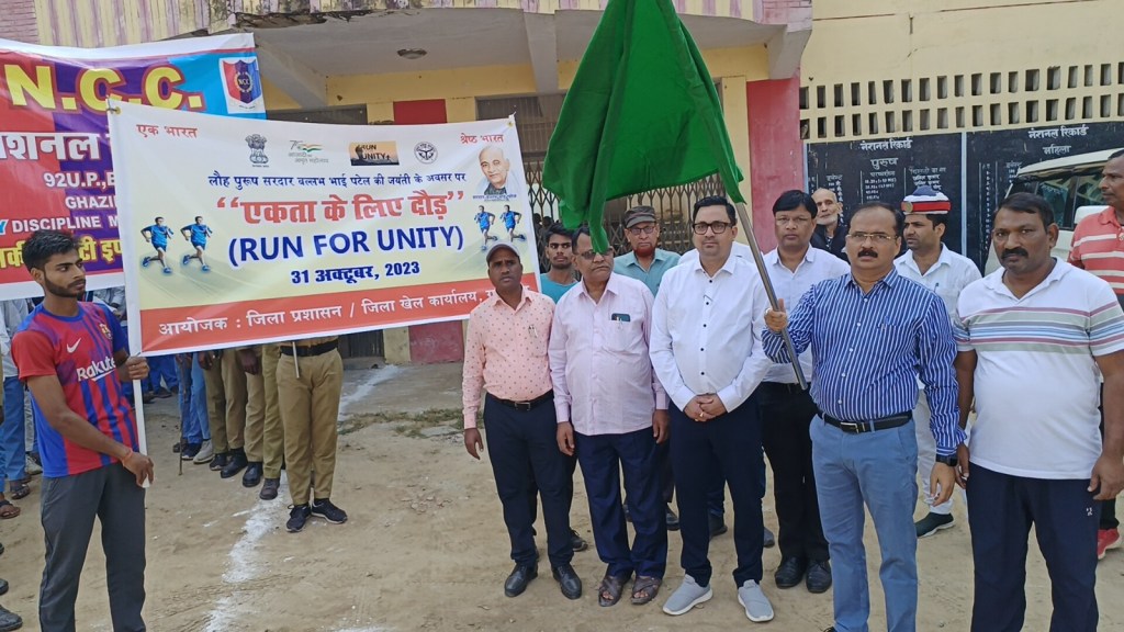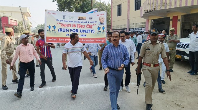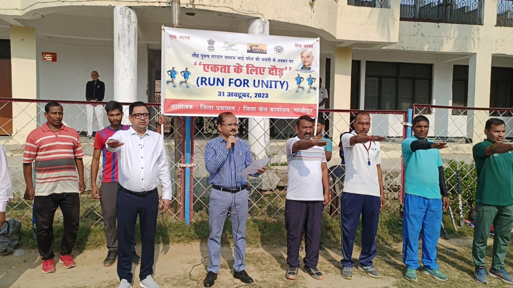 गाजीपुर। लौह पुरुष सरदार वल्लभ भाई पटेल की जयंती के अवसर पर जिला प्रशासन, एनएसएस, युवा कल्याण विभाग, शिक्षा विभाग, आदि के समन्वय से एक विशाल रन फार यूनिटी दौड़ एवं मार्च पास्ट का आयोजन किया गया। जो नेहरू स्टेडियम से प्रारम्भ होकर विभिन्न मार्गो से होते हुए पुनः नेहरू स्टेडियम पर जाकर समाप्त हुआ। मुख्य विकास अधिकारी संतोष कुमार वैश्य ने मंगलवार को राष्ट्रीय एकता दिवस के अवसर पर नेहरू स्टेडियम गोराबाजार से एकता दौड़ को हरी झण्डी दिखाकर रवाना किया तथा स्वयं भी रन फार यूनिटी मे प्रतिभाग किया। युवा, बुजुर्ग ,बच्चे ,महिलाएं समाजसेवी एन सी सी, स्कूली छात्र-छात्राए एवं खिलाड़ी रन फार यूनिटी दौड़ मे सरदार बल्लभ भाई पटेल का एक ही सपना-अखंड भारत देश हो अपना ,अनेकता में एकता- हिंद की विशेषता, देश को आगे बढ़ाना है-रन फार यूनिटी मनाना है, सारे जहां से अच्छा हिंदुस्ता हमारा , हमारी एकता हमारी पहचान है-तभी तो हमारा देश महान है, के गगनभेदी नारो के साथ दौड़ रहे थे। एकता दौड़ नेहरू स्टेडियम से पी जी कालेज चौराहा होते हुए पुलिस लाईन, नवीन स्टेडियम , गोराबाजार होते हुए पुनः नेहरू स्टेडियम पर जाकर समाप्त हुआ। कार्यक्रम स्थल पर पहुचकर मुख्य विकास अधिकारी एंव अन्य अधिकारियों ने सरदार बल्लभ भाई पटेल के चित्र पर माल्यार्पण एवं पुष्प अर्पित कर उन्हे श्रद्धांजलि दी तथा उपस्थित अधिकारियों, कर्मचारियो, संभ्रात नागरिको, स्कूली छात्र-छात्राओ को ‘‘सत्य निष्ठा‘‘ की शपथ दिलाई।