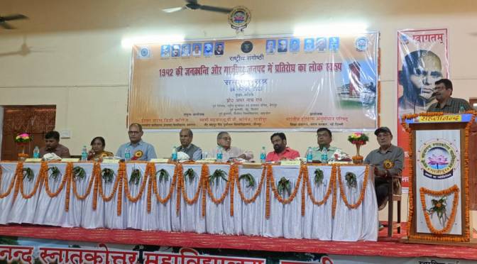 समारोह के मुख्य अतिथि प्रो. अमरनाथ राय ने अपने संबोधन में कहा कि आज की युवपीढ़ी को अपने क्षेत्रीय जनान्दोलन के गौरवशाली विरासत से परिचित कराने की बेहद जरूरत है। विशिष्ट अतिथि प्रो. मालविका रंजन ने इतिहासविदों के माध्यम से 1942 से संबद्ध जनांदोलन में लोक प्रतिरोध को स्पष्ट करने का प्रयास किया। सत्र के अध्यक्ष प्रो. सतीश राय, काशी विद्यापीठ, वाराणसी ने अपने अध्यक्षीय उद्बोधन में कहा कि स्वाधीनता आंदोलन का उत्तरार्द्ध जनांदोलनों का इतिहास है, जिसके महानायक महात्मा गाँधी थे जो लोक के चिर प्रेरणास्रोत रहे। उन्होंने गाँधी को भारतीय लोक-प्रतिरोधी आंदोलनों का सफल नायक बताया। डॉ. अखिलेश त्रिपाठी ने संगोष्ठी के समस्त सत्रों में व्यक्त सम्पूर्ण व्याख्यानों का सार-संक्षेपण प्रस्तुत किया।