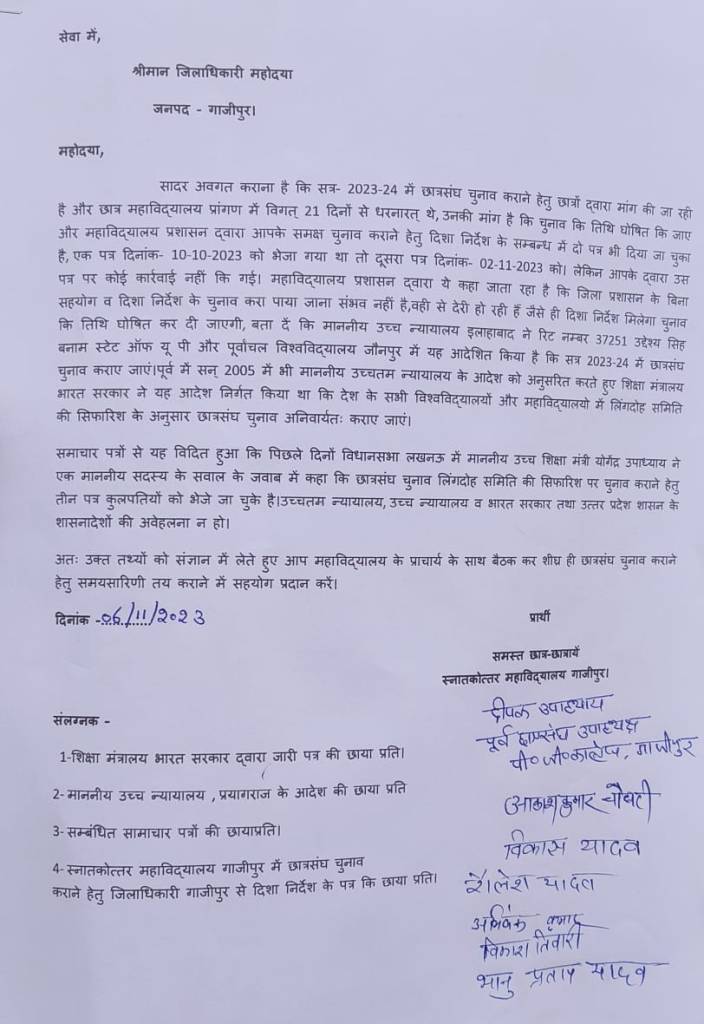 छात्रसंघ प्रतिनिधि मंडल ने जिलाधिकारी से छात्रसंघ चुनाव अनिवार्यतः कराने हेतु उच्चतम न्यायालय व उच्च न्यायालय के आदेशों एवं शिक्षा मंत्री भारत सरकार तथा उच्च शिक्षा मंत्री उत्तर प्रदेश सरकार द्वारा जारी शासनादेशों का जिक्र किया।जिस पर जिलाधिकारी आर्यका अखौरी ने कहा कि हम शासन से पत्राचार कर एक सप्ताह के अंदर शीघ्र अतिशीघ्र चुनाव कराने हेतु महाविद्यालय प्रशासन के साथ बैठक करेंगे ।