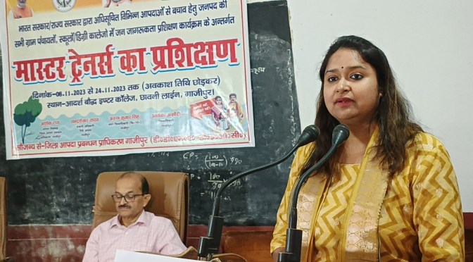 गाजीपुर। भारत सरकार/राज्य सरकार द्वारा अधिसूचित विभिन्न आपदाओं से बचाव हेतु जनपद की सभी ग्राम पंचायतो, विद्यालयों/स्कूलो, डिग्री कालेजो में जन जागरूकता प्रशिक्षण कार्यक्रम के अन्तर्गत मास्टर ट्रेनर्स का प्रशिक्षण कार्यक्रम जिलाधिकारी आर्यका अखौरी द्वारा बुधवार को शुभारम्भ किया गया। यह प्रशिक्षण आदर्श बौद्ध इण्टर कालेज छावनीलाईन में आयोजित किया जा रहा है। यह कार्यक्रम 8 नवम्बर, 2023 से 24 नवम्बर, 2023 तक अवकाश तिथि छोड़कर संचालित रहेगा। कार्यक्रम के प्रथम दिन को तहसील सदर, सैदपुर, जमानियॉ, जखनियॉ, सेवराई, एवं कासिमाबाद के लेखपाल एवं राजस्व निरीक्षको द्वारा मास्टर टेनर का प्रशिक्षण प्राप्त किया गया। इस कार्यक्रम में राज्य सरकार द्वारा घोषित आपदाओं को न्यून करने तथा आपदा घटित होने के उपरान्त त्वरित सहायता दिये जाने के बारे में सभी को अवगत कराया गया। प्रशिक्षण के दौरान जूट के बैग में किट तैयार कर वितरित किया गया। कार्यक्रम का शुभारम्भ जिलाधिकारी के द्वारा दीप प्रज्ज्वलित कर किया गया। जिलाधिकारी ने विद्यालय परिवार को सहयोग के लिए धन्यवाद ज्ञापित कर कार्यक्रम आयोजित करने वाले टीम मे मुख्यतः अपर जिलाधिकारी वि0/रा0 अरूण कुमार सिंह एवं उनके नियंत्राणाधीन कार्मिकों का उत्साह वर्धन किया। अन्त में जिलाधिकारी द्वारा पूरी निष्ठा से आपदा राहत कार्य करने हेतु प्रेरणा दिया। कार्यक्रम का संचालन अशोक राय आपदा विशेषद ने किया।