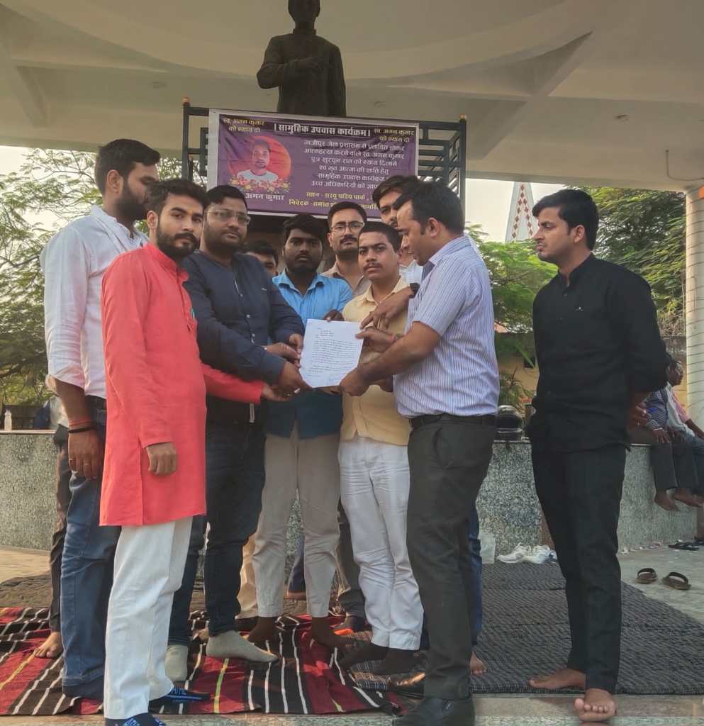 सामूहिक उपवास में बैठे डां शम्मी सिंह, मनीष चौधरी, शिवम उपाध्याय, अभिषेक द्विवेदी, पूर्व छात्रसंघ उपाध्यक्ष दीपक उपाध्याय, सुधांशु तिवारी, अनुज कुमार भारती, आकाश चौधरी, निलेश बिन्द, नितेश सिंह, निखिल राज भारती, विवेक भारती, विनोद कुशवाहा, सर्वजीत मौर्य इत्यादि मौजूद थे।