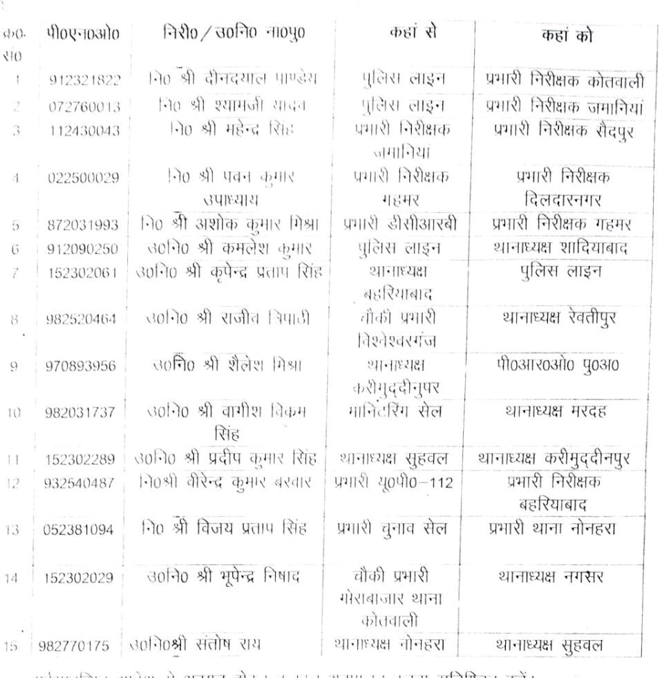 गाजीपुर। एसपी ने कानून व्यवस्था के मद्देनजर कई निरीक्षकों और उप निरीक्षकों की तैनाती में फेरबदल किया है। उन्होंने कई दरोगाओं को इधर से उधर किया है। एक थाना इंचार्ज को एसपी ने लाइन भेजा है। एसपी ओमवीर सिंह ने शुक्रवार को दीनदयाल पांडे को पुलिस लाइन से शहर कोतवाली प्रभारी निरीक्षक बनाया है। इसके साथ ही श्याम जी यादव को पुलिस लाइन से प्रभारी निरीक्षक जमानिया, महेंद्र सिंह को प्रभारी निरीक्षक जमानिया से प्रभारी निरीक्षक सैदपुर, पवन कुमार उपाध्याय को प्रभारी निरीक्षक गहमर से प्रभारी निरीक्षक दिलदारनगर, अशोक कुमार मिश्रा को प्रभारी डीसीआरबी से प्रभारी निरीक्षक गहमर, कमलेश कुमार को पुलिस लाइन से थानाध्यक्ष शादियाबाद, कृपेंद्र प्रताप सिंह को थानाध्यक्ष बहरियाबाद से पुलिस लाइन, राजीव त्रिपाठी को चौकी प्रभारी विशेश्वरगंज से थानाध्यक्ष रेवतीपुर, शैलेश मिश्रा को थानाध्यक्ष करीमुद्दीनपुर से पीआरओ एसपी, बागीश विक्रम सिंह को मॉनिटरिंग सेल से थानाध्यक्ष मरदह, प्रदीप कुमार सिंह को थानाध्यक्ष सुहवल से थानाध्यक्ष करीमुद्दीनपुर, वीरेंद्र कुमार बरवार को प्रभारी यूपी 112 से प्रभारी निरीक्षक बहरियाबाद, विजय प्रताप सिंह को प्रभारी चुनाव सेल से प्रभारी निरीक्षक थाना नोनहरा, भूपेंद्र निषाद को चौकी प्रभारी गोराबाजार से थानाध्यक्ष नगसर और संतोष राय को थानाध्यक्ष नोनहरा से थानाध्यक्ष सुहवल की कमान सौंपी है।
