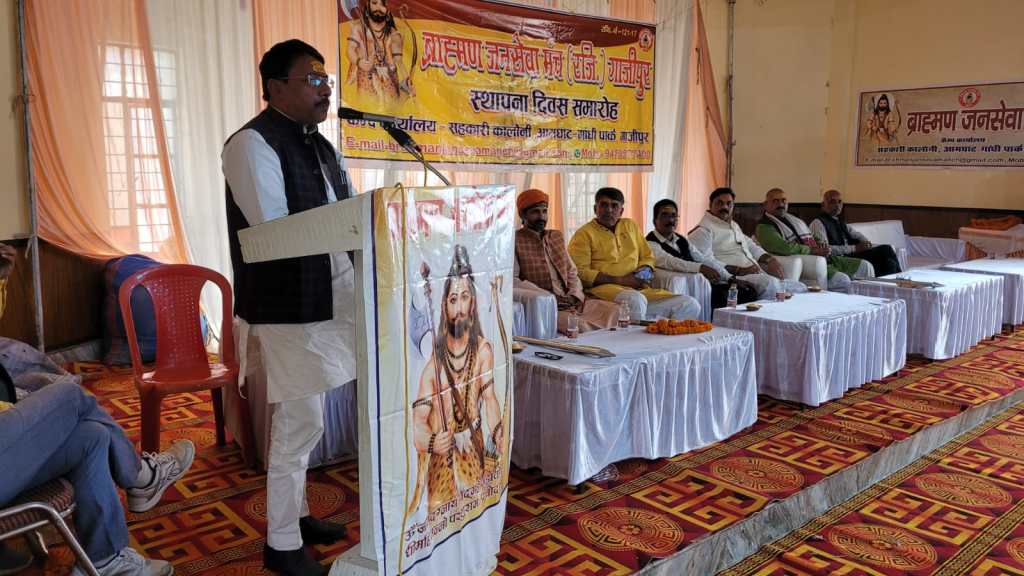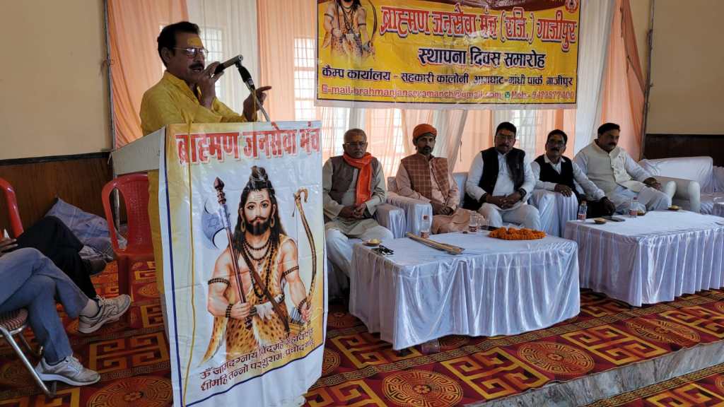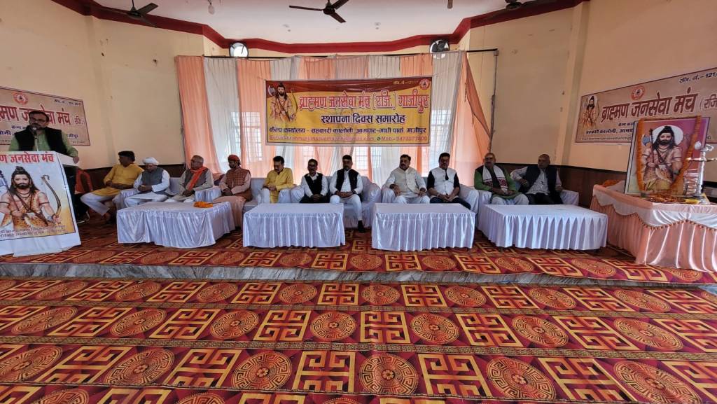 गाजीपुर। ब्राह्मण जन सेवा मंच का आठवां स्थापना दिवस धूमधाम से लंका मैदान में स्थित मैरिज हॉल में रविवार को समारोह पूर्वक मनाया गया। इस कार्यक्रम मे जनपद के समस्त बिकास खंड, ग्राम पंचायतों से ब्राह्मण समाज के सैकड़ों पदाधिकारियों ने भाग लिया। बैठक में सनातन धर्म पर प्रहार करने वाले तथाकथित राज नेताओं की घोर निन्दा की गई। इस मंच के संस्थापक संयोजक प्रदीप चतुर्वेदी ने संयोजन के आठ साल की उपलब्धियों का विस्तृत विवरण देते हुए मंच का नेतृत्व किसी योग्य एवम अनुभवी ब्राह्मण नेता को संभालने की अपील किया जिसे कार्यक्रम में मौजूद पूरे ब्राह्मण समाज ने सिरे से खारिज करते हुए प्रदीप चतुर्वेदी को ही मंच के दायित्व को चलाने का प्रस्ताव पारित किया। इस स्थापना दिवस पर ब्राह्मण जन सेवा मंच में उत्कृष्ट कार्य करने वाले ब्राह्मण नेताओं को भगवान परशुराम का फरसा भेंट कर सम्मानित किया गया। स्थापना दिवस में मुख्य वक्ता के रुप में राज्य कर्मचारी संयुक्त परिषद के पूर्व जिलाध्यक्ष अम्बिका दूबे रहे।