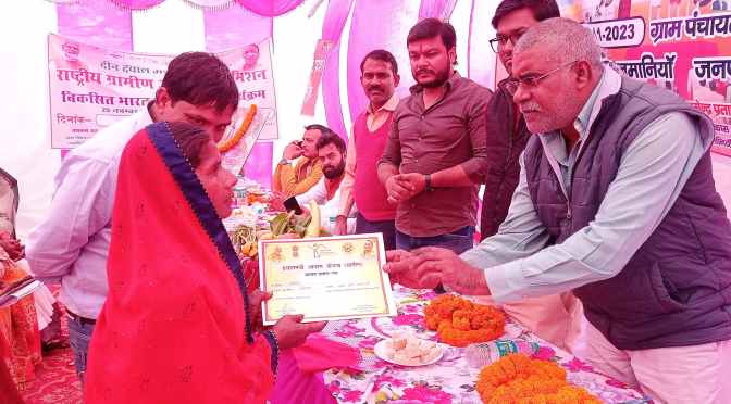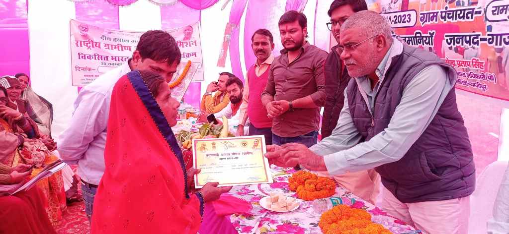 गाजीपुर। भारत सरकार एवं उत्तर प्रदेश सरकार द्वारा आयोजित संकल्प यात्रा कार्यक्रम के अंतर्गत जमानिया ब्लॉक के रामपुरपट्टी सरनाम खा ग्राम सभा में गुरूवार को कार्यक्रम आयोजित किया गया। इस कार्यक्रम में मुख्य अतिथि के रूप में एमएलसी विशाल सिंह चंचल के प्रतिनिधि डॉ प्रदीप पाठक शामिल हुए। मुख्य अतिथि का स्वागत खण्ड विकास अधिकारी जमानिया यशवंत कुमार राव ने किया। इस कार्यक्रम में केन्द्र सरकार और प्रदेश सरकार के विभिन्न योजनाओं के लाभार्थी धनौती देवी, तारा, रीता, अनिता, ममता देवी, पूजा देवी ,रानी देवी, वीरेंद्र यादव,नविक्रमा, राजेश, दीनानाथ, अवधेश, मुलायम, रामविलास, रीता, विनोद श्रीवास्तव, अवधेश सिंह, रविन्द्र यादव, राधेश्याम, सुमित्रा सहित अन्य को एमएलसी प्रतिनिधि डॉ प्रदीप पाठक ने प्रमाण पत्र देकर सम्मानित किया। प्रधानमंत्री नरेन्द्र मोदी द्वारा एवं मुख्यमंत्री योगी आदित्यनाथ द्वारा वर्चुअल जुड़ कर योजना के बारे में लोगों से जाना। इस अवसर पर DPRO अंशुल मौर्य, BDO यशवंत कुमार राव, ADO अमेन्द्र प्रताप सिंह, ग्राम पंचायत अधिकारी अरुण कुमार पांडेय, ADO Ag दीपक, आंगनबाड़ी विभाग, हिमांशु सिंह, योगी हर्ष सिंह, प्रधान राम आधार यादव, BDC एवं बूथ अध्यक्ष अजय यादव, मण्डल अध्यक्ष अरविंद राय, प्रधान जीवपुर सुनील सिंह, प्रधान सैदाबाद संदीप सहित अन्य उपस्थित थे।