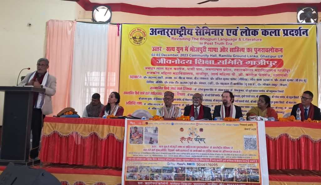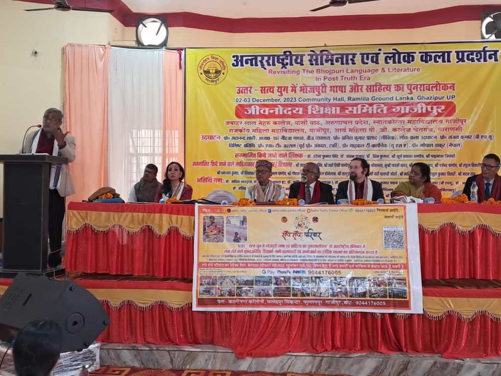 गाजीपुर। भारतीय लोक साहित्य एवं संस्कृति को संरक्षित एवं संवर्धित करने के उद्देश्य से जीवनोदय शिक्षा समिति, राजकीय महिला स्नातकोत्तर महाविद्यालय एवं स्नातकोत्तर महाविद्यालय के संयुक्त तत्वाधान में आयोजित ‘उत्तर सत्ययुग में भोजपुरी भाषा एवं संस्कृति का पुनरावलोकन’ विषय पर दो दिवसीय अंतरराष्ट्रीय सेमिनार का शुभारंभ शनिवार को किया गया। कार्यक्रम के उद्घाटन सत्र में मुख्य वक्ता के रूप में प्रो सदानंद शाही ने कहा कि उत्तर सत्य का अर्थ होता है सत्य के बाद का समय। सत्य के बाद या तो झूठ होता है या अति सत्य। भोजपुरी इसी की शिकार है। उसके नाम पर तमाम तरह के झूठ फैलाए गए हैं। तमाम तरह के मनगढ़ंत आरोप मढ़े गए है। यह भोजपुरी का दुर्भाग्य ही है कि आज संसद में भोजपुरी के बड़े बड़े कलाकार बैठे हैं लेकिन भोजपुरी आठवीं अनुसूची में शामिल नहीं हो पाई है। भोजपुरी को आठवीं अनुसूची में शामिल होने से हिन्दी को कोई खतरा नहीं है। इसी क्रम में लीबिया से पधारे प्रोफेसर अनिल प्रसाद ने कहा कि भोजपुरी में लोक की आत्मा बसती है भोजपुरी भाषा का क्षेत्र व्यापक है। यह भारत के गांव देहातों से होते हुए विश्व की कई देशों में अपना विस्तार किया है।भोजपुरी संघर्ष की भाषा है और इसकी सुगंध श्रम के माध्यम से पूरी दुनिया में फैला हुआ है। तुर्की से पधारी एस टी जस्सल ने कहा कि भोजपुरी भाषा एवं साहित्य को सजोने का कार्य सदियों से स्त्रियों ने किया है। वही इसकी समृद्धि का आधर हैं। प्रो पृथ्वीराज जी ने कहा कि भोजपुरी की संस्कृति कृषि की संस्कृति है, जिसमें साझेपन को महत्व दिया गया है।