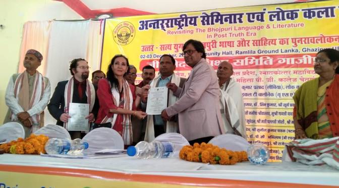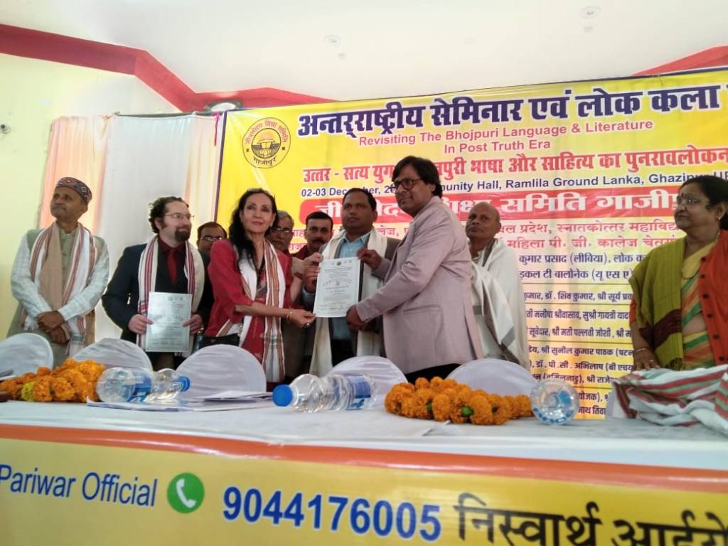 अमेरिका से आए माइकल बोनेलॉक ने कहा कि भोजपुरी भाषा और साहित्य संगीतमय है। लय इस भाषा की प्राण है। कार्यक्रम की अध्यक्षता करते हुए डा नीरजा माधव जी ने कहा कि भोजपुरी अपने उत्कृष्ट साहित्य के चलते सम्मान पाएगी न कि राजकीय संरक्षण से। आज भी हमारे यहां के मांगलिक कार्य इसी भाषा में रचित गीत के माध्यम से ही संपन्न होते हैं। इस अवसर पर जीवनोदय शिक्षा समिति ने उच्च शिक्षा के क्षेत्र में बेहतर योगदान देने और छात्र हित को सदैव प्राथमिकता में रखने वाले राजकीय महिला स्नातकोत्तर महाविद्यालय गाजीपुर के डा शिव कुमार एवं डा संतन कुमार राम ‘ को बेस्ट शिक्षक अवार्ड’ से सम्मानित किया। इस अवसर पर पी जी कालेज के शिक्षक डा हरेंद्र सिंह एवं सूर्य प्रकाश पाण्डेय को भी सम्मानित किया गया। इस सत्र का संचालन जयनंदन ने किया तथा धन्यवाद ज्ञापन डा रामनारायण तिवारी ने किया। दूसरे सत्र में पवन बाबू के संयोजन में सांस्कृतिक कार्यक्रम की श्रृंखला शुरू हुई जिसमें देर रात तक लोक कलाकारों की प्रस्तुति चलती रही। इस कार्यक्रम में लोक कर्मी गोपाल ठाकुर,डा सानंद सिंह, डा निरंजन कुमार यादव, जितेंद्रनाथ राय, शेर खां, डा राघवेंद्र पांडेय, आर्य पुत्र दीपक, उदय प्रताप पाल,डा विश्वनाथ मिश्र, डा सर्वेश पांडेय, डा गजेंद्र पाण्डेय, काज़ी फरीद आलम, डॉ अशोक कुमार सिंह, जयशंकर, अमरनाथ तिवारी, संजीव कुमार वरुण, उरूज फातिमा, छत्रशाल सिंह आदि के साथ शोधार्थी एवं सुधी श्रोता उपस्थित रहे।