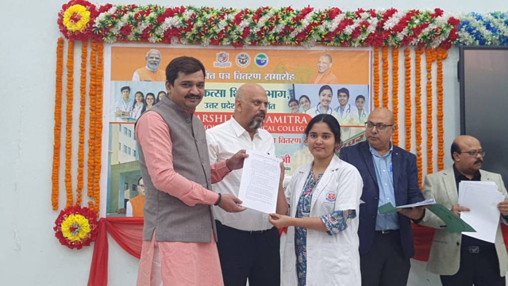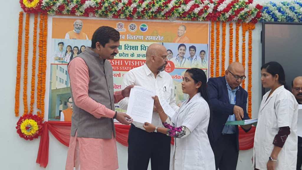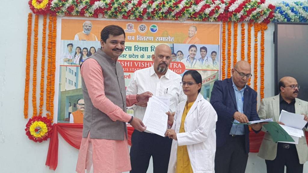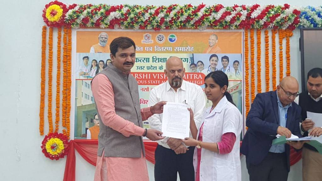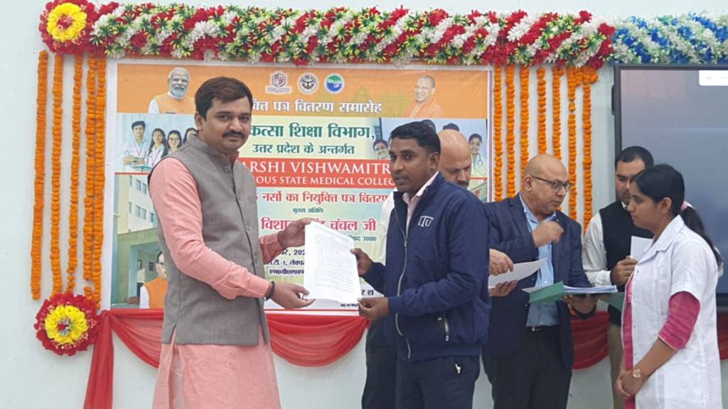 गाजीपुर। महर्षि विश्वामित्र मेडिकल कालेज सभागार में एक कार्यक्रम के तहत नर्सों को नियुक्ति पत्र प्रदान किये गए। इस दौरान 141 स्टाफ नर्सों को नियुक्ति पत्र प्रदान किये गए। एमएलसी विशाल सिंह चंचल ने स्टाफ नर्सों को मंगलवार को नियुक्ति पत्र प्रदान किया। उत्तर प्रदेश के योगी आदित्यनाथ ने आज यूपी में 2341 स्टाफ नर्सों को नियुक्ति पत्र प्रदान किये है। इन नर्सों को यूपी के विभिन्न मेडिकल कालेज और सरकारी अस्पतालों में तैनात किया गया है। इस बड़ी संख्या में नर्सों के पदों पर हुई नियुक्ति से लोगों को बेहतर स्वास्थ्य सेवाएं और मेडिकल सुविधाएं मिलेंगी। इस मौके पर एमएलसी विशाल सिंह चंचल ने कहा कि यूपी सरकार लोगों को समुचित स्वास्थ्य सेवाएं देने के लिए लगातार ठोस कदम उठा रही है। उन्होंने कहा कि सरकार लोगों को बेहतर स्वास्थ्य सुविधा प्रदान करने में जुटी हुई है ,लगभग हर जिले में अब मेडिकल कॉलेज खोला जा रहा है, इससे जिले में डॉक्टरों की कमी पूरी हो रही है जिससे अधिक लोगों का उपचार किया जा रहा है, मैंने शहर की जनता और प्राचार्य की माँग पर महिला अस्पताल में हेल्थ एटीएम मशीन भी दिया है, आगे भी शासन से और सुविधाओं को बढ़ावा मिले इसका सार्थक प्रयास किया जाएगा।