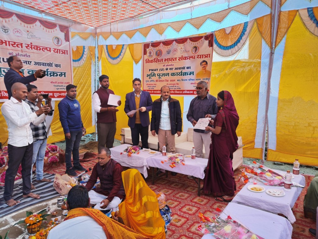 गाजीपुर। विकसित भारत संकल्प यात्रा के अंतर्गत डूडा विभाग द्वारा संचालित प्रधानमंत्री आवास योजना शहरी में जनपद के नगर पालिका परिषद गाजीपुर के वार्ड जमलापुर के लालबहादुर कुशवाहा, रीना देवी, मनीषारानी, कंचन का भूमि पूजन कार्यक्रम का आयोजन किया गया, जिसका शुक्रवार को मुख्य अतिथि एमएलसी प्रतिनिधि प्रदीप पाठक द्वारा सामूहिक भूमि पूजन संपन्न कराया गया। लाभार्थियों को प्रमाण पत्र भी दिया। इस अवसर पर अपर जिलाधिकारी अरुण कुमार सिंह, परियोजनाओं अधिकारी चन्द्रशेखर यादव, सिविल इंजीनियर अर्जुन सिंह उपस्थित रहे। कार्यक्रम के दौरान क्षेत्र के सभासद एवं क्षेत्र के अन्य लोग उपस्थित रहे।