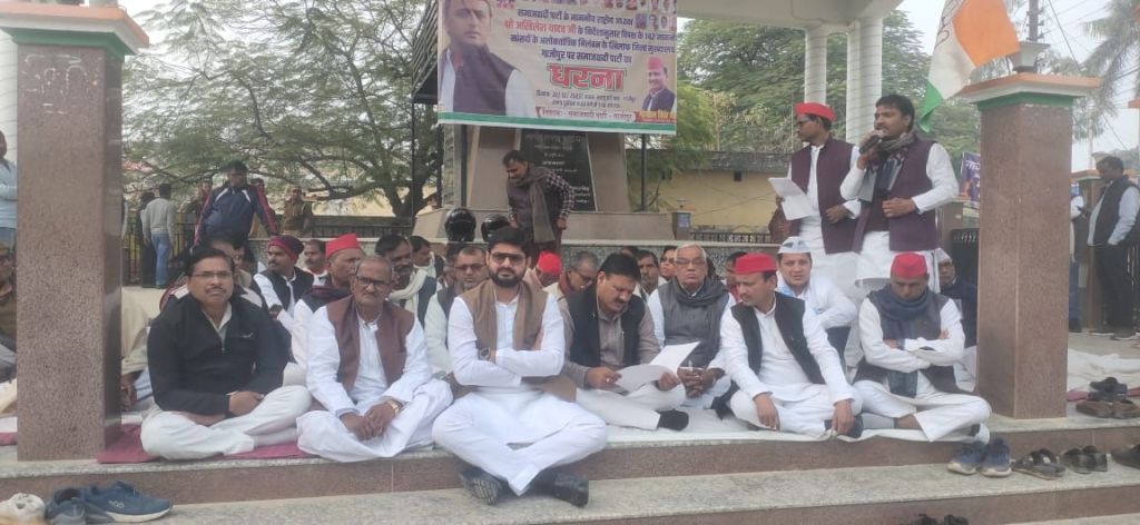 ग़ाज़ीपुर।शुक्रवार को इंडिया गठबंधन की बैठक में सर्वसम्मति से लिए गए फैसले के अनुसार समाजवादी पार्टी के राष्ट्रीय अध्यक्ष अखिलेश यादव के निर्देशानुसार समाजवादी पार्टी और इंडिया गठबंधन में शामिल कांग्रेस,आम आदमी पार्टी,भाकपा माले, भारतीय कम्यूनिस्ट पार्टी,मार्कस्वादी कम्युनिस्ट पार्टी आदि अन्य दलों के संयुक्त तत्वावधान में जिलाध्यक्ष गोपाल यादव के नेतृत्व में शहर मुख्यालय स्थित सरजू पांडे पार्क में 146 सांसदो के अलोकतांत्रिक निलम्बन के खिलाफ” लोकतंत्र -संविधान बचाओं-भाजपा हटाओ ” नारे के साथ धरना देकर विरोध जताया।