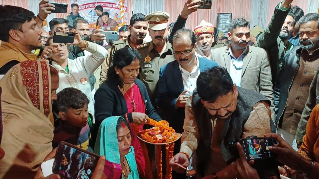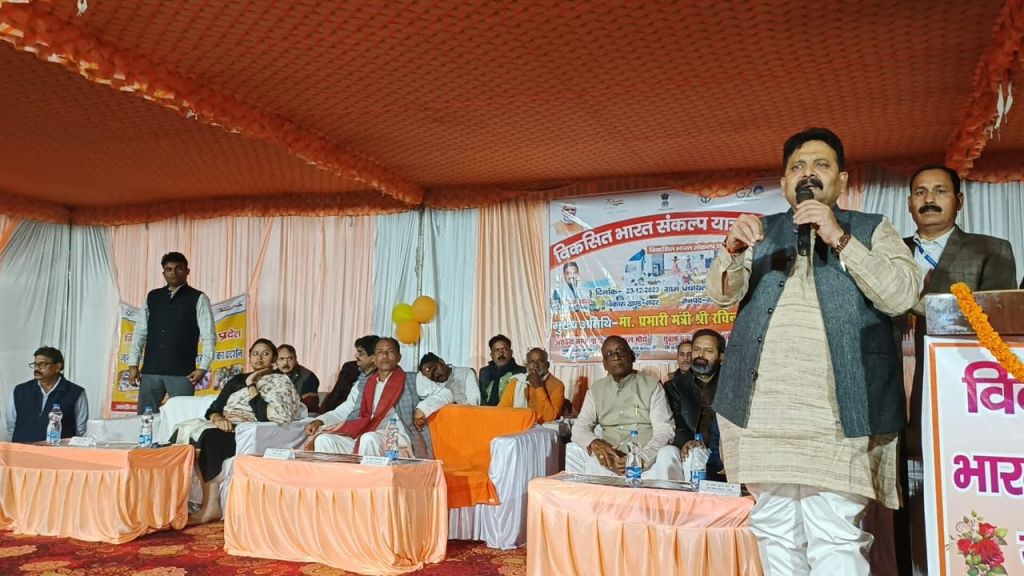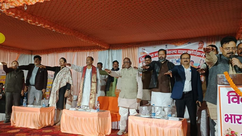 मंत्री ने उज्जवला योजना, राशन कार्ड, आयुष्मान कार्ड, विधवा पेंशन एवं अन्य प्रकार की कल्याणकारी योजनाओं के बारे मे जानकारी देतु हुए बताया कि सरकार की मंशा है कि देश के प्रत्येक नागरीकों को जो योजना प्राप्त करने के योग्य है उन्हे अवश्य योजना का लाभ प्रदान किया जायेगा। कार्यक्रम के दौरान उन्होने योजनाओं से वंचित लोगो से जानकारी लेते हुए कहा कि जो भी पात्र व्यक्ति छुट गये है वे लगाये गये स्टाल पर सम्पर्क कर अपना रजिस्टेशन करा ले जिससे उनको योजनाओं का लाभ दिया जा सके। कार्यक्रम मे शौचालय, मत्सय, आयुष्मान, प्रधानमंत्री आवास योजना एवं अन्य योजनाओं से लाभान्वित पात्रो को प्रमाण पत्र का वितरण किया गया तथा आवास पात्र लाभार्थियों को आवास की चाभी एवं कृषि विभाग द्वारा अनुदानित ट्रेक्टर की चाभी का भी वितरण किया गया। इस दौरान मंत्री द्वारा महिला एवं बाल विकास विभाग के माध्यम से महिलाओ की गोदभराई एवं अन्न प्रासन भी कराया। कार्यक्रम के दौरान विभिन्न योजनाओ का स्टाल लगाया गया था, जिसका अवलोकन मंत्री ने किया। कार्यक्रम के दौरान मंत्री ने उपस्थित लोगो को पंच प्रण की शपथ दिलायी। कार्यक्रम के दौरान जिलाधिकारी आर्यका अखौरी, जिला अध्यक्ष भाजपा सुनिल सिंह, मुख्य विकास अधिकारी, जिला विकास अधिकारी एवं अन्य संबंधित जनपद स्तरीय अधिकारी उपस्थित रहे।
