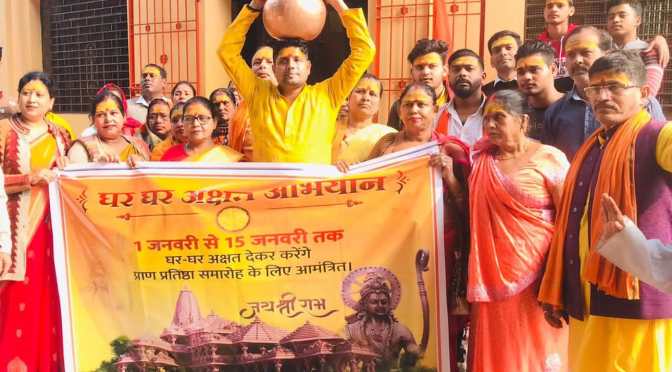जो 1 जनवरी से बस्ती प्रमुख के ही नेतृत्व में प्रत्येक सनातनियों के घर 15 जनवरी तक पहुंचाया जाएगा। इस अवसर पर जिला संघ चालक जयप्रकाश वर्मा, नगर संघ चालक दीनदयाल जायसवाल, नगर कार्यवाहक अंजनी श्रीवास्तव, सभासद उषा जायसवाल, मिडिया प्रमुख गर्वजीत सिंह, रवि राज हिंदू, सुधीर केशरी, मनीष जायसवाल, अमन शर्मा, रंजीत चौधरी, वरुण वर्मा, अंजू देवी, रीता वर्मा, विनोद विश्वकर्मा, कलावती देवी, आशा देवी, मीना देवी, सह नगर कार्यवाह अभिषेक शौंडिक, अमर जीत सिंह, ह्रदय प्रकाश वर्मा, हिमालय जयसवाल, मनोज जयसवाल सहित आदि लोग मौजूद रहे।