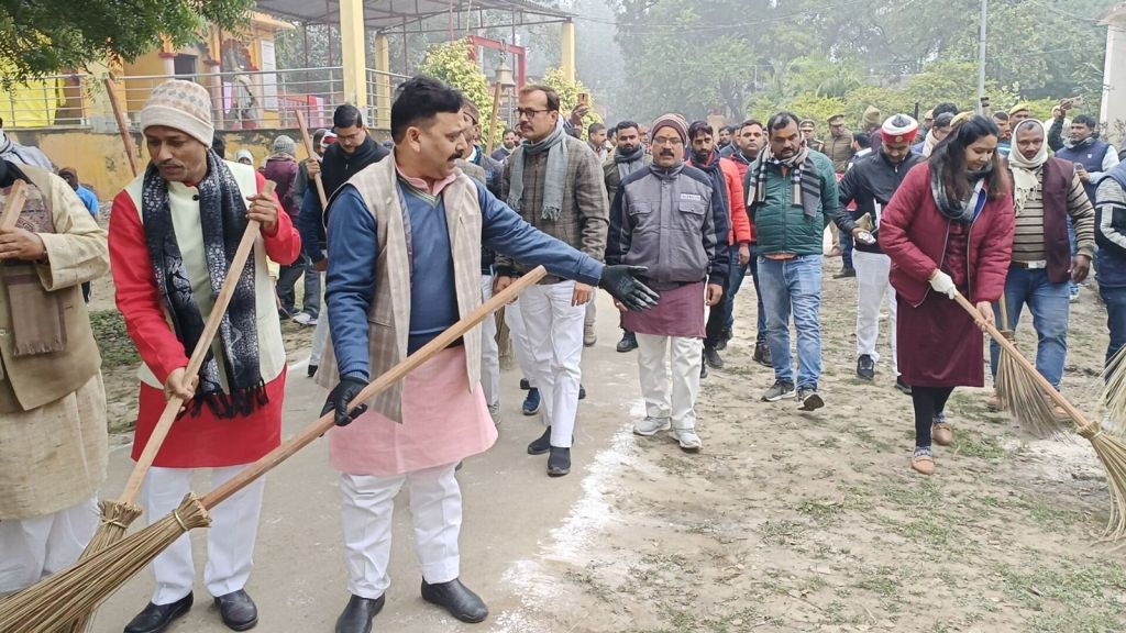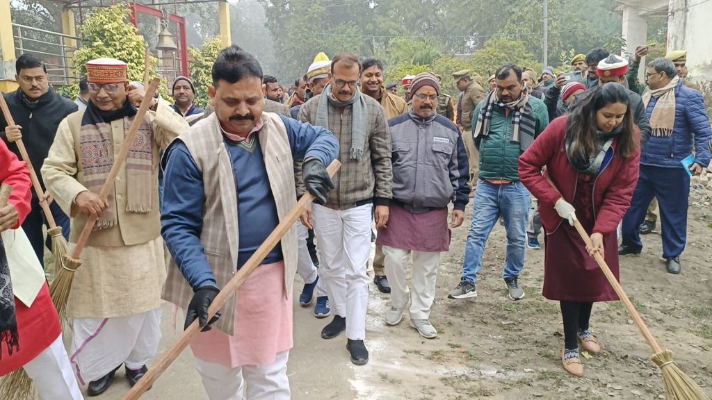 गाजीपुर। प्रधानमंत्री एवं मुख्य मंत्री के आवाह्न पर देश प्रदेश में स्वच्छता अभियान कार्यक्रम संचालित किया गया है। 22 जनवरी 2024 को अयोध्या में भगवान श्रीराम के मन्दिर में प्राण प्रतिष्ठा के अवसर पर 14 जनवरी 2024 से 22 जनवरी 2024 तक जनपद में स्वच्छता अभियान के अन्तर्गत विशेष सफाई अभियान कार्यक्रम चलाया जा रहा है। जिसके क्रम मे मंगलवार को जनपद के प्रभारी मंत्री रवीन्द्र जायसवाल ने वराह घाट मंदिर औड़िहार के मंदिर प्रागंण एवं आस पास में अधिकारियों संग स्वच्छता अभियान में बढचढ कर हिस्सा लिया एवं साफ-सफाई की। मंत्री ने मंदिर परिसर में स्वयं झाड़ू एवं फावडे के साथ उपस्थित होकर साफ-सफाई करते हुए लोगो को स्वच्छता के प्रति जागरूक एवं अपील किया। इस अवसर पर जिलाधिकारी आर्यका अखौरी, मुख्य विकास अधिकारी संतोष कुमार वैश्य, जिला अध्यक्ष भाजपा सुनील सिंह, जिला पंचायत अध्यक्ष सपना सिंह, जिला विकास अधिकारी, परियोजना निदेशक, पुलिस अधिक्षक शहर, उपजिलाधिकारी सैदपुर एवं अन्य जनपद स्तरीय अधिकारी उपस्थित रहे।