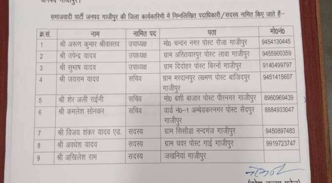 गाजीपुर। समाजवादी पार्टी के राष्ट्रीय अध्यक्ष अखिलेश यादव और प्रदेश अध्यक्ष नरेश उत्तम पटेल की अनुमति और निर्देश पर जिलाध्यक्ष गोपाल यादव ने शुक्रवार को अपनी जिला कार्यकारिणी का विस्तार किया। उन्होंने कुछ पदाधिकारियों को प्रोन्नत करते हुए जिला कार्यकारिणी के पदाधिकारियों की संशोधित सूची जारी किया। इस क्रम में उन्होंने कार्यकारिणी में जिला सचिव एवं मीडिया प्रभारी तथा प्रवक्ता रहे अरुण कुमार श्रीवास्तव को जिला उपाध्यक्ष, मीडिया प्रभारी एवं प्रवक्ता पद की जिम्मेदारी सौंपी हैं। इसी क्रम में उन्होंने सदस्य रहे उपेन्द्र यादव और सुभाष यादव उर्फ गुड्डू को भी जिला उपाध्यक्ष नामित किया है। इसके साथ-साथ जयराम यादव, शेर अली राईनी और कमलेश सोनकर को जिला सचिव तथा विजय शंकर यादव, अवधेश यादव और अखिलेश राम को सदस्य पद पर नामित किया है। जिलाध्यक्ष गोपाल यादव ने नये पदाधिकारियों को बधाई देते हुए भरोसा जताया है कि सभी पदाधिकारी अपनी जिम्मेदारियों का ईमानदारी से निर्वहन करते हुए पार्टी के भरोसे पर शत प्रतिशत खरा उतरने का काम करेंगे।