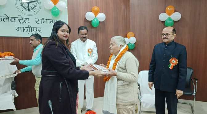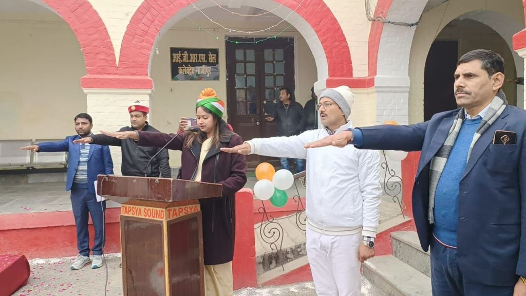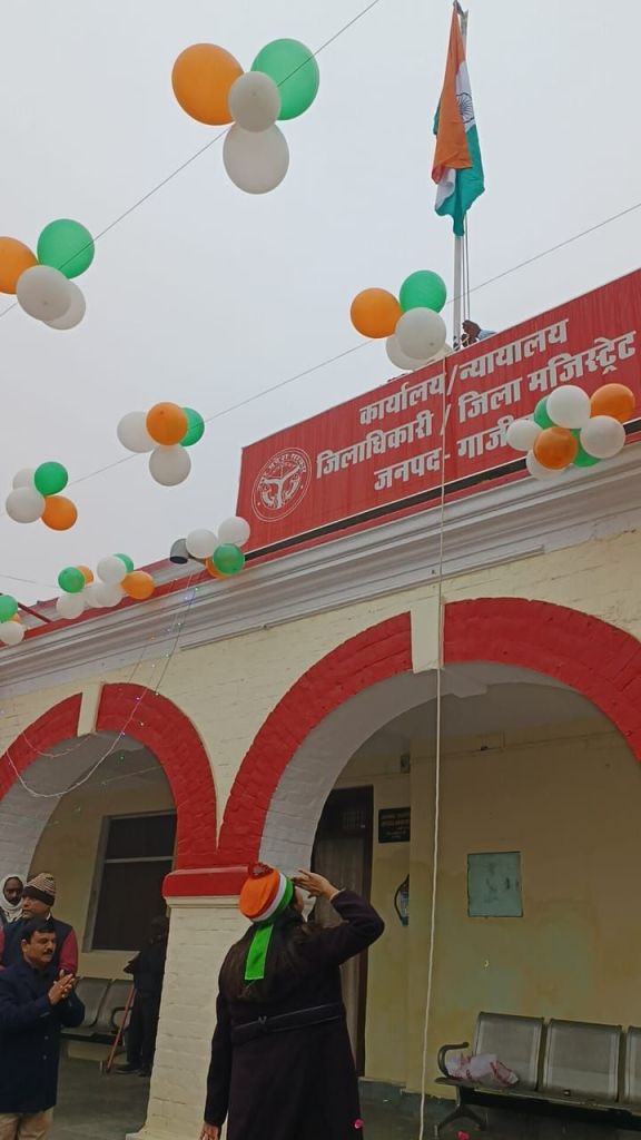 गाजीपुर। कलेक्ट्रेट परिसर में 75वां गणतन्त्र दिवस हर्षाेल्लास के साथ मनाया गया। कार्यक्रम के मुख्य अतिथि जिलाधिकारी आर्यका अखौरी ने ध्वजारोहण कर उपस्थित सभी को एकता और अखंडता की शपथ दिलायी। इसके उपरान्त स्कूली बच्चों को मिष्ठान का वितरण किया गया तथा स्वतन्त्रता संग्राम सेनानियों के आश्रितो को अंगवस्त्रम व मिष्ठान देकर सम्मानित किया गया। जिलाधिकारी आर्यका अखौरी ने गणतंत्र दिवस की 75 वीं वर्षगांठ पर हार्दिक शुभकामनाएं देते बधाई दी तथा रायफल क्लब सभागार में जनपद के स्वतंत्रता संग्राम सेनानियो /आश्रितो को अंगवत्र एवं मिष्ठान देकर सम्मानित किया। कार्यक्रम के दौरान जिलाधिकारी ने गणतंत्र दिवस के अवसर पर देश के महान विभूतियों एवं स्वतंत्रता संग्राम सेनानियो के जीवन चरित्र पर प्रकाश डालते हुए विस्तृत रूप जानकारी दी। कार्यक्रम के दौरान विभिन्न विद्यालय के छात्र-छात्राओं द्वारा सांस्कृतिक कार्यक्रमों पर मनमोहक प्रस्तुतियां पेश की गयी। जिलाधिकारी द्वारा समस्त छात्र/छात्राओं को उनकी मनमोहनक प्रस्तुति के लिए प्रशंसा करते हुये सभी को कार्यक्रम में सम्मिलित होने पर धन्यवाद दिया। गणतंत्र दिवस समारोह मे अपर जिलाधिकारी वि0रा0 अरूण कुमार सिंह, मुख्य राजस्व अधिकारी , उपजिलाधिकारी सदर एवं अन्य जिला स्तरीय अधिकारी, कलेक्ट्रेट के कर्मचारीगण उपस्थित थे।