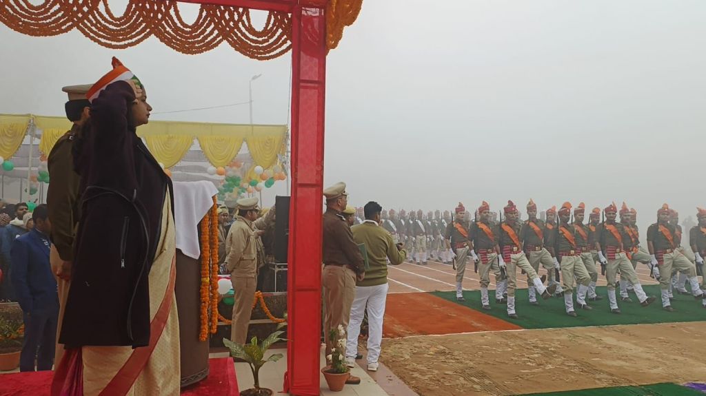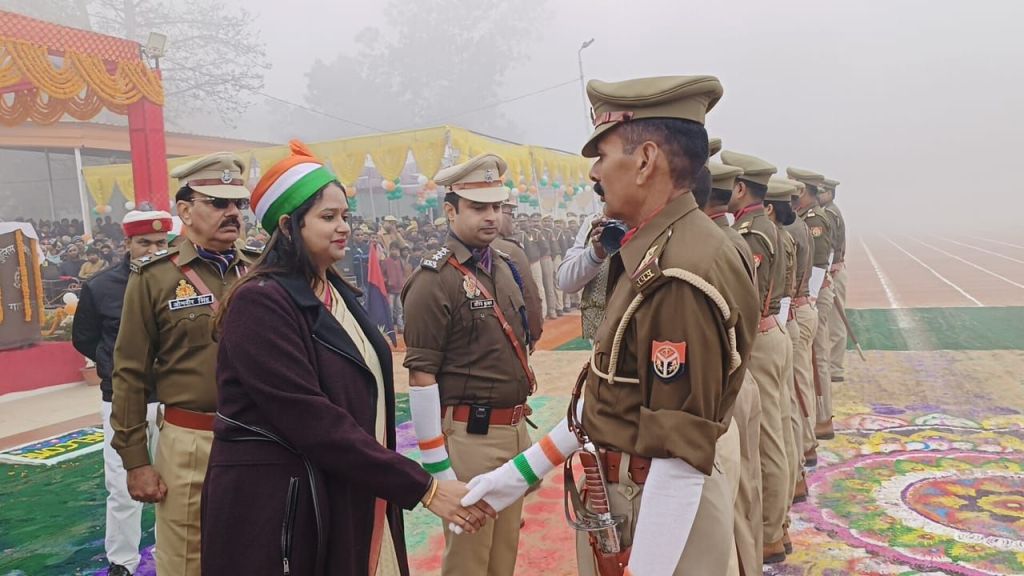 गाजीपुर। जिलाधिकारी आर्यका अखौरी पुलिस लाईन में गणतंत्र दिवस समारोह में शामिल हुई। जहां पुलिस अधीक्षक ओमवीर सिंह ने उनका स्वागत किया। गणतंत्र दिवस के अवसर पर पुलिस लाईन मैदान में मुख्य अतिथि के रूप मे उपस्थित जिलाधिकारी ने झंडा फहराया तथा पुलिस लाइन में परेड की सलामी ली । परेड में शामिल विभिन्न टोलियों द्वारा मुख्य मंच से गुजरते हुए मुख्य अतिथि को सलामी दी गई। मुख्य अतिथि ने परेड को कमान्ड कर रहे प्रथम, द्वितीय व सभी टोली के कमान्डर से परिचय प्राप्त किया। इसके उपरान्त मुख्य अतिथि द्वारा सराहनीय सेवा मेडल, जनपद मे उत्कृष्ट कार्य करने वाले अधिकारियों/कर्मचारियों को लगाया गया तथा प्रशस्ति पत्र देकर उन्हे सम्मानित किया गया।