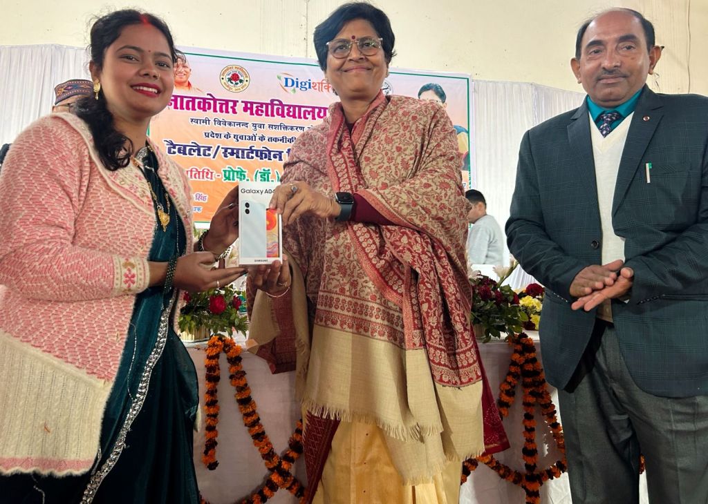 गाजीपुर। स्नातकोत्तर महाविद्यालय में शनिवार को विवेकानंद युवा सशक्तिकरण योजना के तहत स्मार्टफोन वितरण कार्यक्रम आयोजित किया गया। इस कार्यक्रम में मुख्य अतिथि के तौर पर वीर बहादुर सिंह पूर्वांचल विश्वविद्यालय की कुलपति प्रोफेसर डॉ. वन्दना सिंह मौजूद रहीं। इस दौरान कुल 500 छात्र-छात्राओं को स्मार्टफोन वितरित किया गया।