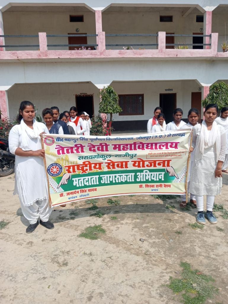 गाजीपुर। भारत निर्वाचन आयोग के निर्देशानुसार लोक सभा सामान्य निर्वाचन-2024 हेतु स्वीप कार्यक्रम के अन्तर्गत राजकीय महिला स्नातकोत्तर महाविद्यालय में स्वीप कोर्डिनेटर अमित यादव ने मतदाता जागरूकता पर लघु नाटिका का मंचन व राष्ट्रीय सेवा योजना के सप्त दिवसीय शिविर का आयोजन छात्राओ की उपस्थित में सम्पन्न किया। इसी क्रम में मतदाता जागरूकता रैली में जन-जन की है यही पुकार वोट डालो अबकी बार का नारा पं0 दीनदयाल उपाध्याय राजकीय महाविद्यालय सैदुपर, तेतरी देवी महाविद्यालय सरायगोकुल द्वारा जागरूकता रैली में देते हुए अपने निर्धारित स्थल पर जाकर रैली समाप्त किया गया। रैली के दौरान छात्राओ द्वारा मतदाता जागरूकता से संबंधित गगन भेदी नारे लगाये जा रहे थे।