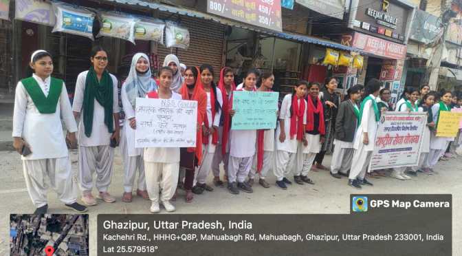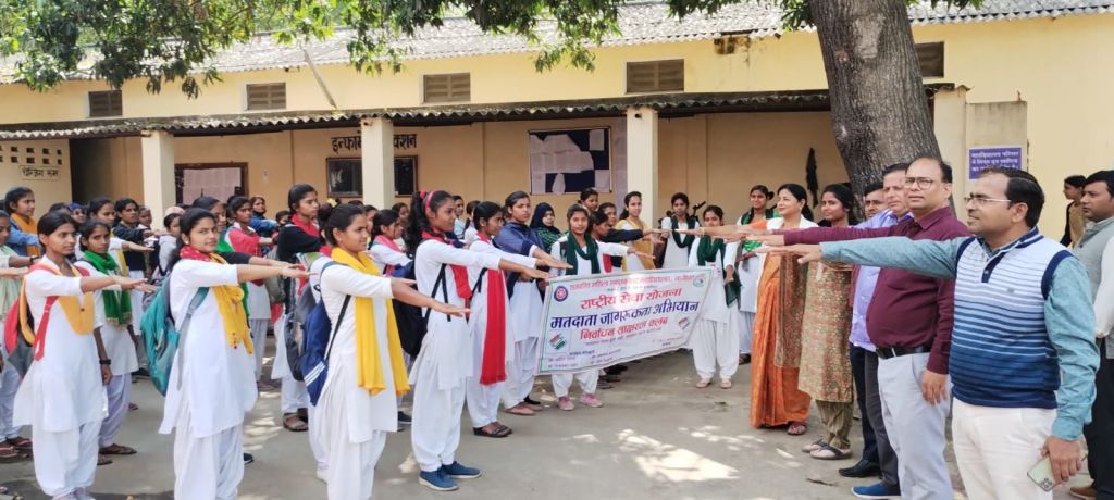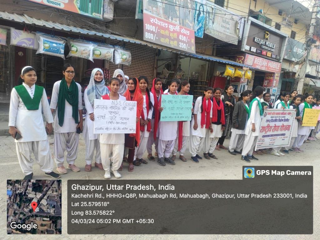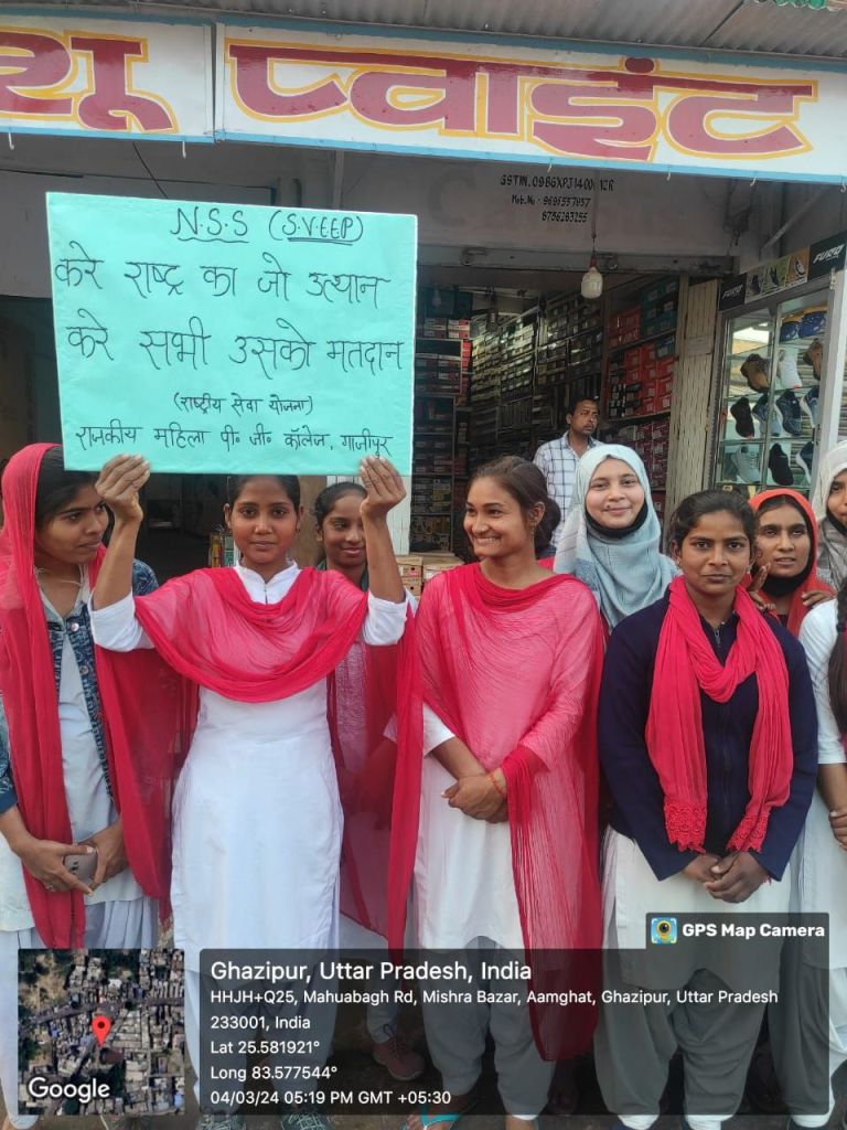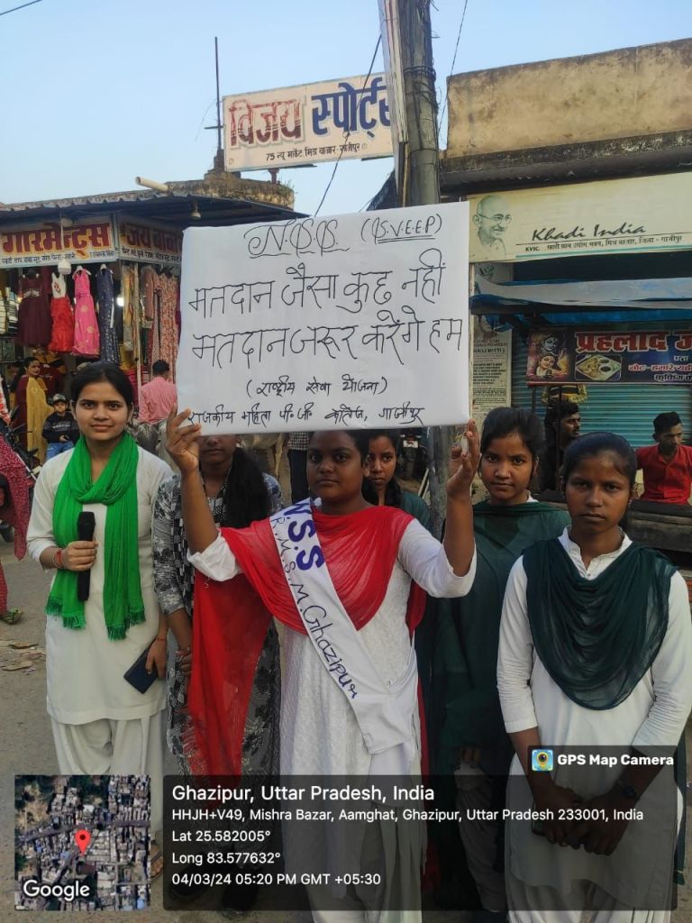 स्वीप कार्यक्रम के अन्तर्गत राष्ट्रीय सेवा योजना(एन.एस.एस) के तहत राजकीय महिला महाविद्यालय महुआबाग,बापू महाविद्यालय सादात, हिन्दू स्नातकोत्तर महाविद्यालय जमानियॉ, राजकीय हाईस्कूल कनुवान भॉवरकोल में विद्यालय के प्रधानाचार्य एवं शिक्षक की उपस्थिति में छात्राओ द्वारा जागरूकता रैली निकाली गई। जागरूकता रैली शहर/गॉव के विभिन्न मार्गो, चौराहो से होते हुए अपने निर्धारित स्थल पर समाप्त हुई। जागरूकता रैली समाप्त के उपरान्त छात्राओं को मतदाता की शपथ दिलाई गयी। रैली के दौरान छात्राओ द्वारा मतदाता जागरूकता से संबंधित गगन भेदी नारे लगाए जा रहे थे। छात्राओ द्वारा नारे व स्लोग्न के माध्यम से मतदान जैसा कुछ नही मतदान जरूर करेगे हम, चाहे नर हो या नारी मतदान है सबकी जिम्मेदारी, लोकतंत्र हो तभी महान सब करें जहां मतदान, बनो देश के भाग्य विधाता अब जागो प्यारे मतदाता, जागरूक देश की है पहचान हो शत प्रतिशत मतदान, करें राष्ट्र का जो उत्थान करें उसी को हम मतदान, के नारे लगाती रही ।