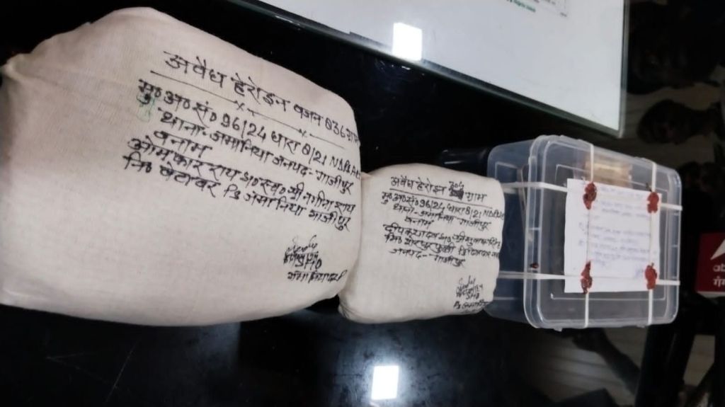 गाजीपुर। अन्तर्राज्यीय मादक पदार्थ (हेरोइन) की अवैध तस्करी करने वाले गिरोह के दो अभियुक्तों को एक किलो 140 ग्राम मादक पदार्थ हेरोइन के साथ पुलिस ने गिरफ्तार किया। हेरोइन की अन्तर्राष्ट्रीय कीमत लगभग दो करोड़ रूपये बताया जा रहा है। इसकी जानकारी देते हुए एसपी कार्यालय में शनिवार को प्रेस वार्ता कर एसपी ओमवीर सिंह ने दिया। एसपी ने बताया कि स्वाट/सर्विलांस व थाना जमानिया पुलिस की संयुक्त टीम द्वारा अन्तर्राज्यीय मादक पदार्थ (हेरोइन) की अवैध तस्करी करने वाले गिरोह के दो अभियुक्तों को गायघाट मोड से एक किलो 140 ग्राम मादक पदार्थ हेरोइन और दो पहिया वाहन संख्या UP61AQ9597 के साथ गिरफ्तार किया। एसपी ने बताया कि हेरोइन की अन्तर्राष्ट्रीय कीमत लगभग दो करोड़ रूपये है। गिरफ्तार तस्करों ने पूछताछ में बताया कि हम लोग पिछले कुछ समय से हेरोइन तस्करी के धंधे में संलिप्त हैं। हमारा मुख्य सरगना रामानन्द यादव निवासी ग्राम- सोनहरिया थाना जमानियां है, जिसे पिछले महीने यू0पी0 एसटीएफ ने वाराणसी से पकड़कर नागालैण्ड पुलिस को सौंपा था, जो अभी जेल में है। तस्करों ने बताया कि अधिक पैसा कमाने के लालच में हम लोग अन्य राज्यों से तस्करी कर लाने वाले लोगों से यहाँ पर खरीद कर उसे अलग-अलग जगहों पर अलग-अलग लोगों को ऊँचे दामों पर विक्रय कर मिलने वाले पैसों को आपस में बाँट लेते हैं और उसी पैसे से अपने परिवार का भरण-पोषण व अपने शौक पूरे करते हैं। गिऱफ्तार अभियुक्त में दीपक यादव पुत्र सुभाष सिंह यादव निवासी शेरपुर फुल्ली थाना दिलदारनगर और ओमकार राय पुत्र स्व0 नगीना राय निवासी बेटावर थाना जमानियां है।