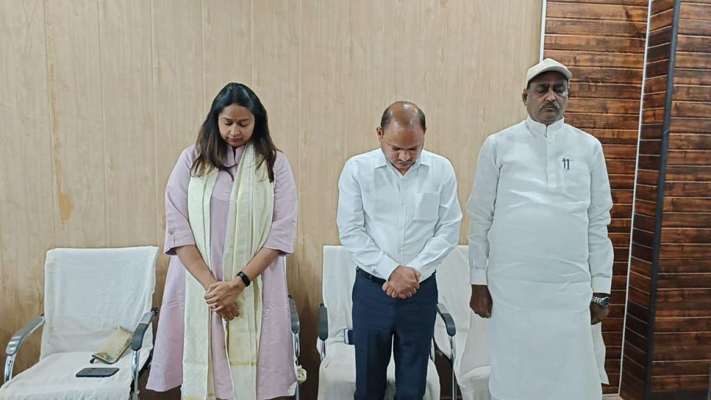गाजीपुर। अधिशासी अधिकारी नगर पालिका परिषद गाजीपुर आलोक कुमार सिंह के आकस्मिक निधन पर शोक संवेदना व्यक्त कर मृतक की आत्मा की शान्ति के लिए ईश्वर से प्रार्थना किया गया। स्व0 सिंह का निधन उनके पैत्रिक आवास पर ही हुआ। इनका आवास जनपद आजमगढ था। उन्होने नगर पालिका परिषद गाजीपुर मे 24 जुलाई 2023 को कार्यभार ग्रहण किया था। जिलाधिकारी आर्यका अखौरी, अपर जिलाधिकारी वि0रा0 दिनेश कुमार, डिप्टी कलेक्टर चन्द्रशेखर यादव, अध्यक्ष नगर पालिका परिषद प्रतिनिधि विनोद अग्रवाल एवं समस्त कार्यालय के कर्मचारी, वार्ड सदस्यो ने नगर पालिका परिषद के सभागार मे उपस्थित होकर स्व0 सिंह के चित्र पर श्रद्धांजलि देते हुए शोक संवेदना व्यक्त की। जिलाधिकारी ने मृतक के कार्याे और चरित्र की सराहना करते हुए कहा कि आज की यह घटना निश्चित तौर पर बहुत ही दुखत है। ईश्वर इस दुख की घड़ी मे मृतक के परिजनो कोे सहन शक्ति प्रदान करे। उन्होने उपस्थित अधिकारियों/कर्मचारियों को तनाव मुक्त होकर कार्य करने की सलाह देते हुए अपने-अपने स्वास्थ्य पर भी ध्यान देने की बात कही।