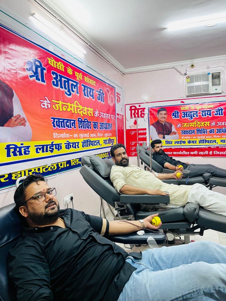 रक्तदान शिविर को लेकर नवीन राय टोनी ने कहा कि मऊ, गाजीपुर, वाराणसी, बलिया जिलों समेत दिल्ली, पंजाब, हरियाणा, बिहार राज्यों में भी सांसद अतुल के समर्थकों ने सैकड़ों यूनिट रक्तदान किया। सिंह हॉस्पिटल में अयोजित रक्तदान शिविर में अनस जमाल, विक्रांत सिंह लक्की, हैप्पी राय, रेहान अशरफ, मिनाज, प्रमोद यादव लकी, ओमकार रॉय गोलू, नित्यानंद त्रिपाठी, हर्ष रॉय, योगेश, शिवम, अभिषेक राय, अभिषेक सिंह, सुनील राय, अमितोष राय, अमित पांडेय, पवन राय, बंटी राय, आयुष राय और अभिषेक त्रिपाठी सहित दर्जनों युवाओं ने रक्तदान किया।