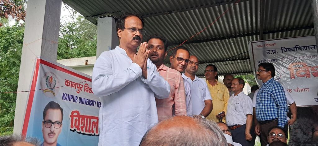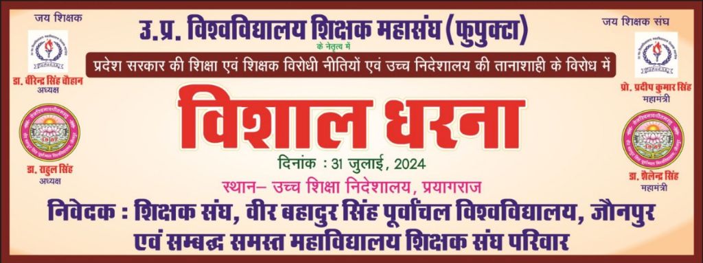 गाजीपुर। विश्वविद्यालय महाविद्यालय शिक्षक महासंघ के आह्वान पर बुधवार को उच्च शिक्षा निदेशालय, प्रयागराज पर 11 बजे से शिक्षकों द्वारा विशाल धरने का आयोजन हुआ। पुरानी पेंशन बहाली, स्थानांतरण में महाविद्यालय प्रबंधन के अनापत्ति प्रमाण-पत्र की अनिवार्यता की समाप्ति जैसे 26 सूत्रीय माँगों को लेकर उत्तर प्रदेश विश्वविद्यालय महाविद्यालय शिक्षक महासंघ ने धरने के माध्यम से सरकार के समक्ष अपनी माँग रखी और सरकार के उपेक्षात्मक रवैया के प्रति क्षोभ एवं आक्रोश व्यक्त किया।