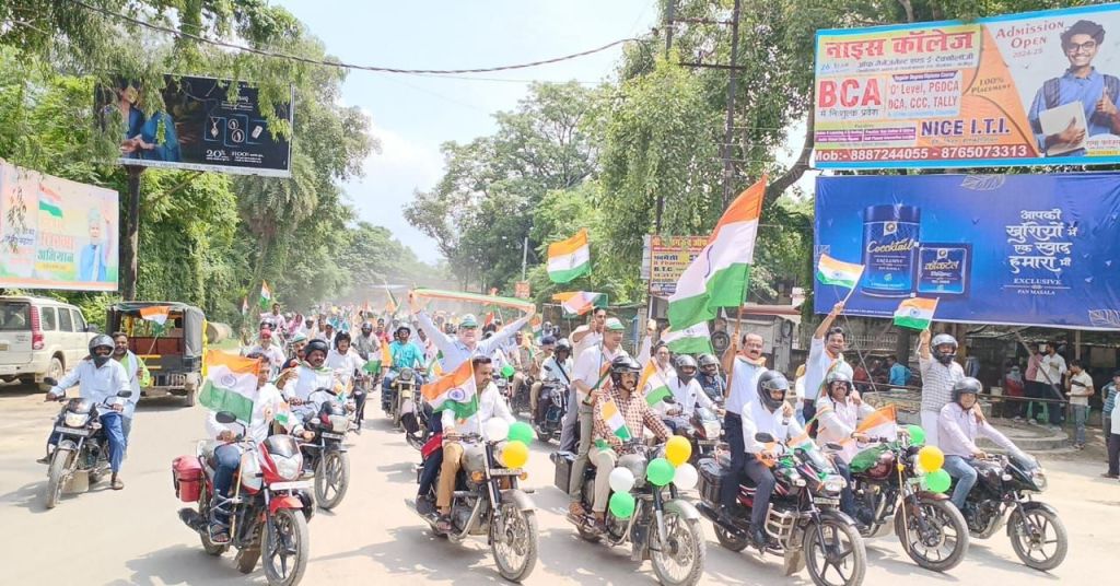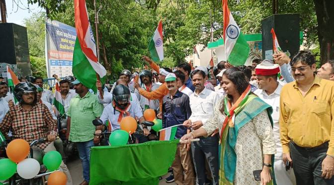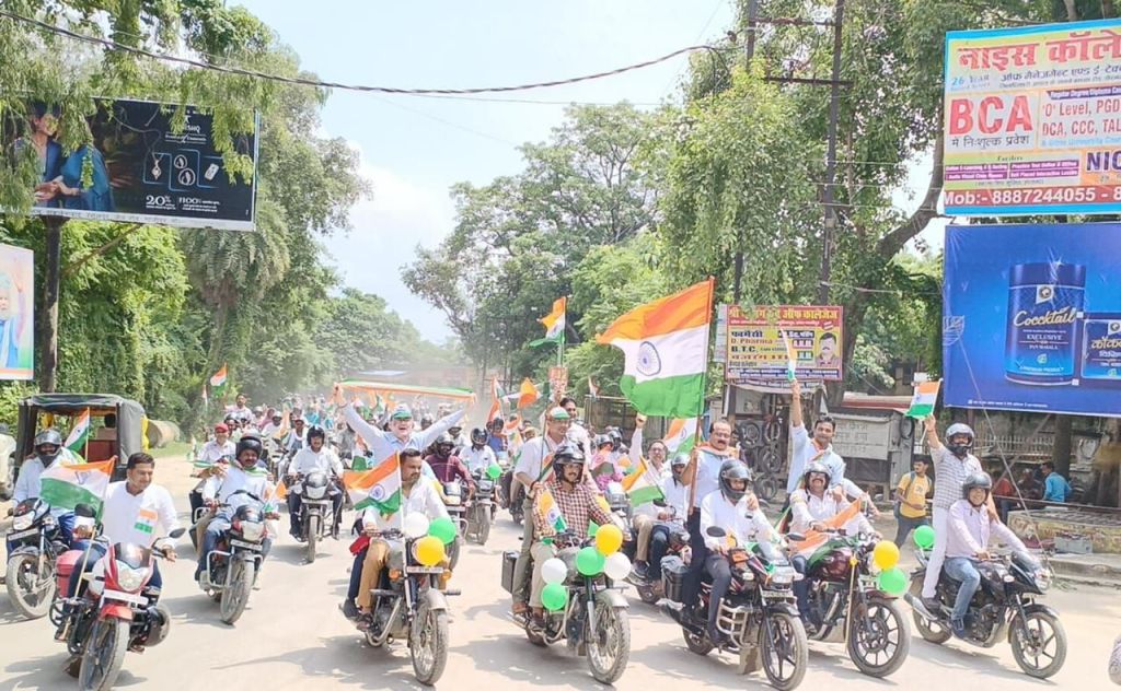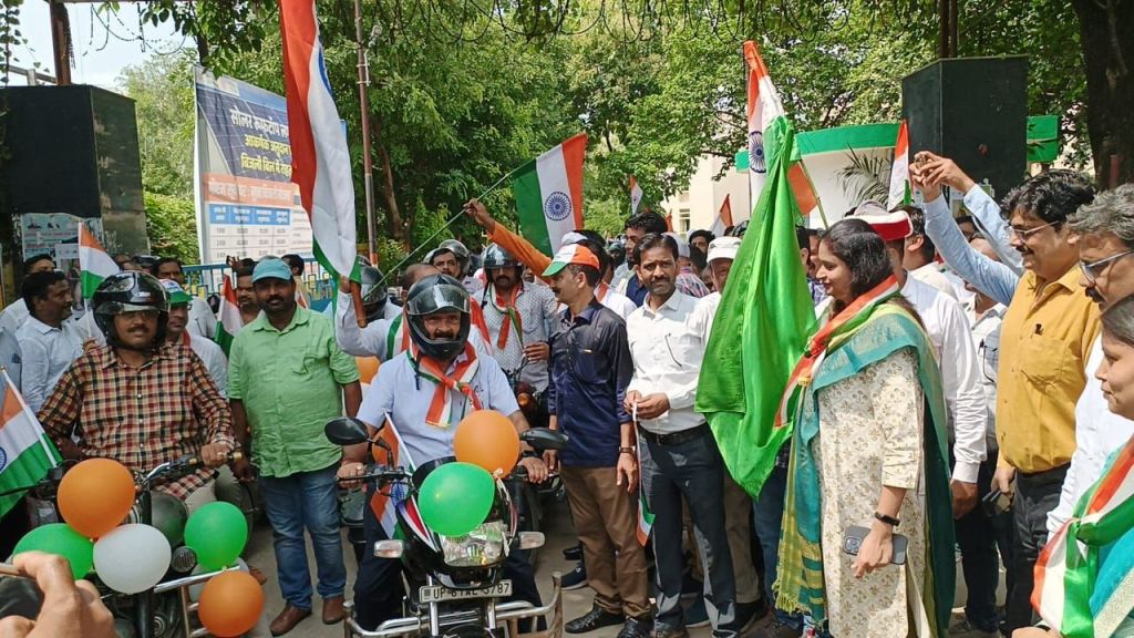 गाजीपुर। ‘‘आजादी का अमृत महोत्सव‘‘ के अन्तर्गत ‘हर घर तिरंगा‘ कार्यक्रम के आयोजन को भव्य रूप से मनाए जाने के लिए मंगलवार को तिरंगा बाईक रैली निकाली गई। रैली को जिलाधिकारी आर्यका अखौरी ने विकास भवन से हरी झण्डी दिखाकर रवाना किया। रैली की अगुवाई मुख्य विकास अधिकारी संतोष कुमार पाल ने खुद बाईक चलाकर की एवं जनपदवासियों को संदेश दिया की हर घर तिरंगा फहराकर जनपद को प्रथम स्थान लाना है। रैली विकास भवन से प्रारम्भ होकर सैनिक चौराहा (भूतहियाटाड), लंका, विशेश्वरगंज, महुआबाग, कलेक्ट्रेट, सिचाई विभाग चौराहा होते हुए विकास भवन आकर समाप्त हुई।