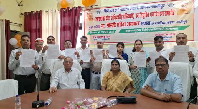 नगर पालिका अध्यक्ष सरिता अग्रवाल ने बताया कि आज पूरे प्रदेश में 1036 शोध अधिकारियों को सभी जनपद मुख्यालयों पर नियुक्ति पत्र का वितरण किया जा रहा है। जिसके क्रम में आज गाजीपुर के मुख्य चिकित्सा अधिकारी कार्यालय के सभागार में 12 चयनित लोगों को नियुक्ति पत्र वितरित किया गया है । उन्होंने बताया कि यह पद पिछले कई सालों से खाली पड़ा हुआ था। जिसके कारण विभाग का डाटा एंट्री संविदा कर्मचारी या फिर आउटसोर्सिंग कर्मचारियों के भरोसे पूरा किया जाता था। बावजूद उसके कुछ ना कुछ खामी रह जाया करते थे लेकिन अब इनकी नियुक्ति हो जाने से अब डाटा एंट्री में सुधार आएगी।