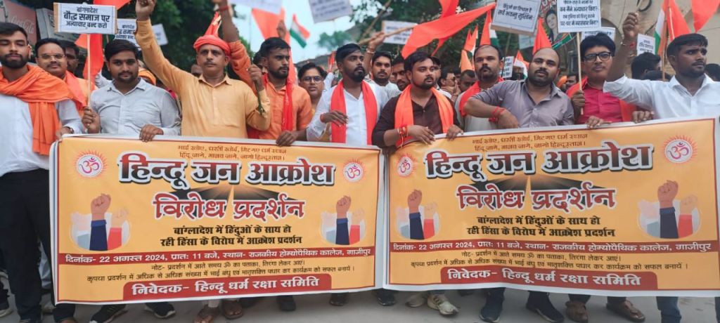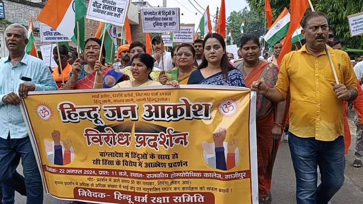 आज गाजीपुर के सभी हिन्दु संगठन जिसमें व्यापारिक, सामाजिक व धार्मिक संगठनो द्वारा बांग्लादेश में हो रहे हिन्दुओ प्रति अत्याचार के विरूद्ध जनाक्रोष मार्च किया गया। आज हम भारत सरकार को इस ज्ञापन के माध्यम से निवेदन करते है कि बांग्लादेश के साथ साथ विश्व के हिन्दू समुदाय की सहायता व सुरक्षा के लिए जो आवश्यक कदम अतिशीघ्र उठाकर प्रभावी कार्यवाही करे। जिससे हिन्दु समाज की सुरक्षा हो सके। महामहिम राष्ट्रपति भारत गणराज्य को सम्बोधित ज्ञापन उपजिलाधिकारी सदर प्रखर उत्तम को सरयू पाण्डेय पार्क में दिया गया। इस अभियान के समर्थन में सिविल बार एसोसिएशन, अति प्राचीन रामलीला कमेटी हरिशंकरी, श्री हंसयोग आश्रम, प्रजापति ब्रम्हकुमारी आश्रम, श्रीगुरूसंत आश्रम गुरूबाग, आर्यसमाज समिति, गायत्री शक्तिपीठ, बालदुर्गा पूजा समिति नबाबगंज, मानस समिति हनुमान मंदिर कोट, नव युवक दुर्गा पूजा समिति मारकीनगंज, संयुक्त दुर्गा पूजासमिति चीतनाथ, जिला उद्योग व्यापार मण्डल, बजरंग दल, हिन्दु जागरण मंच, भारत विकास परिषद, अधिवक्ता परिषद, भारतीय किसान संघ, भारतीय मजदूर संघ, वनवासी कल्याण आश्रम समिति रहा।