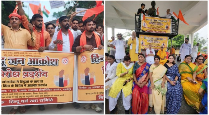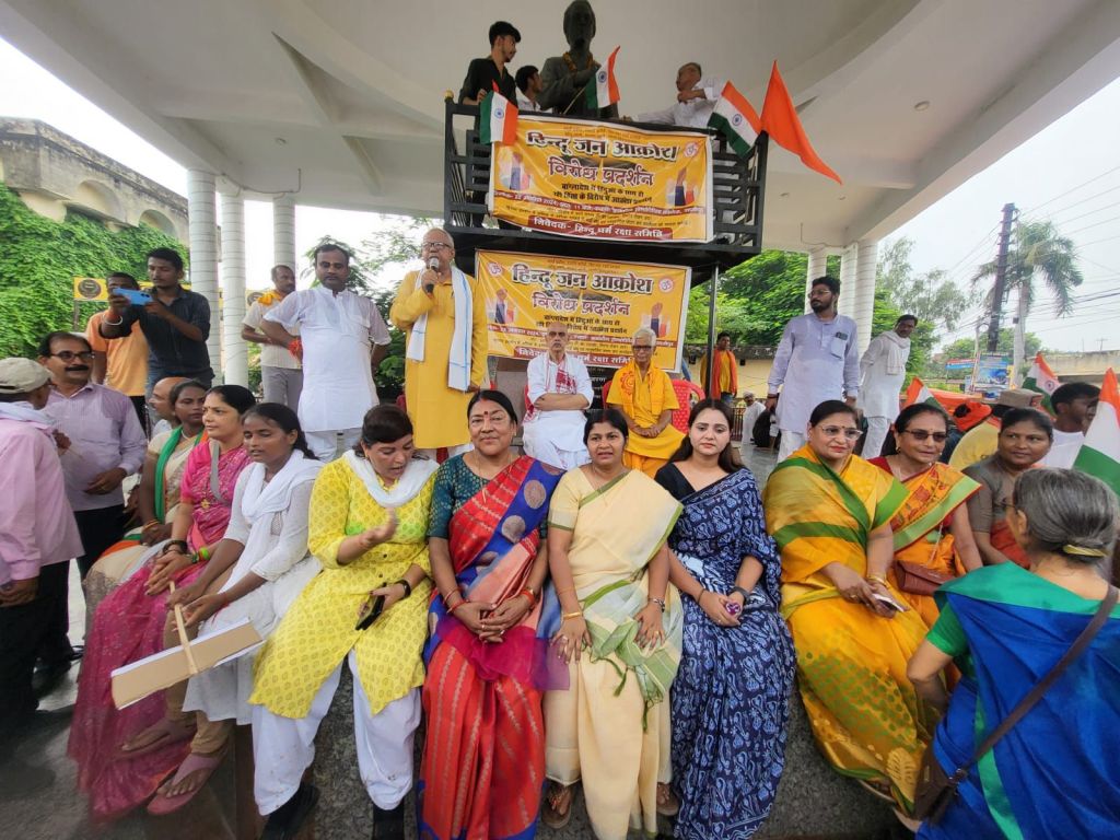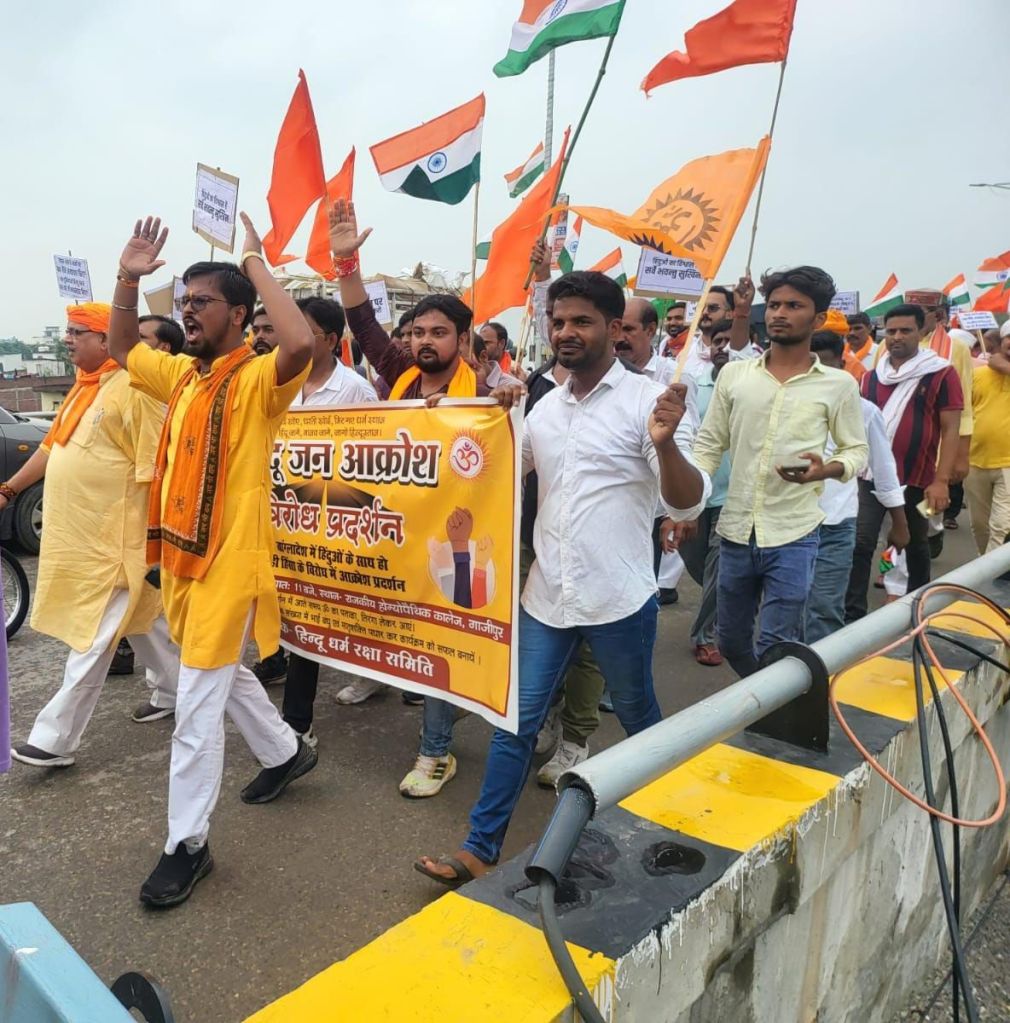 गाजीपुर। हिन्दुओं के महा जन आक्रोश मार्च हिन्दु समाज के लिए बांग्लादेश सहित पुरे विश्व में हिन्दुओं की सुरक्षा सुनिश्चित करने के उददेश्य से गुरूवार को राजकीय होम्योपैथीक कालेज गुरूबाग रौजा से रैली निकाली गयी, जो ओवरब्रिज विशेष्वगंज होते हुए महुआबाग, ओपियम फैक्ट्री होते हुए कचहरी स्थित सरयू पाण्डेय पार्क मे आकर सभा में तब्दील हो गयी। जिसमें व्यक्ता के रूप में सच्चिदानन्द राय, अधिवक्ता रणजीत सिंह, गायत्री शक्तिपीठ के सुरेन्द्र नाथ सिंह, आदित्य प्रकाश आर्य समाज, दिनेश चन्द्र पाण्डेय विश्व हिन्दु परिषद ने कहा कि बांग्लादेश में हर जिले में यह वीभत्स कुकृत्य होने की सूचना है कटटरपंथियांे के निशाने पर शमशान तक नही बचे है मंदिरो को भारी क्षति पहुचाई गयी है।