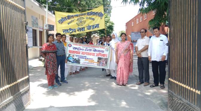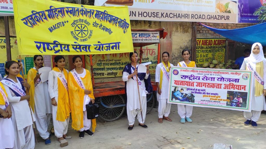 गाजीपुर। यातायात सुरक्षा जागरूकता कार्यक्रम के अंतर्गत राष्ट्रीय सेवा योजना राजकीय महिला स्नातकोत्तर महाविद्यालय की स्वंयसेवी छात्राओं ने जागरूकता रैली का आयोजन गुरूवार को किया। रैली को प्राचार्य प्रो अनिता कुमारी ने हरी झंडी दिखाकर रवाना किया। रैली के दौरान छात्राएं ‘सड़क सुरक्षा की यही पुकार बिना हेलमेट के सब बेकार, चलायें आप कोई भी वाहन यातायात नियमो का सदैव करें पालन, सीट बेल्ट जरूर लगायें दुर्घटना को दूर भगायें, शराब पीकर गाड़ी न चलाए ट्रैफिक नियमों को अपनायें नारा लगाती रही। महुआ बाग चौराहे पर छात्राओं ने बिना हेलमेट बाइक चला रहे लोगों को रोककर उन्हें समझाया कि बिना हेलमेट के वाहन न चलाएं।