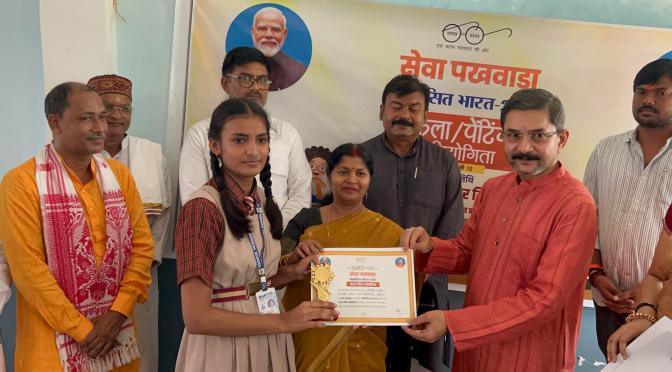कार्यक्रम संयोजक जिला महामंत्री ओमप्रकाश राय ने बताया कि बच्चों ने प्रधानमंत्री नरेंद्र मोदी का स्क्रेच, वोकल फॉर लोकल के तहत चित्रकला, निबंध, रंगोली के जरिए अपनी प्रतिभा का प्रदर्शन किया। साथ ही विकसित भारत 2047 विषय पर भाषण के माध्यम से बहुमुखी प्रतिभा दिखाई। इससे पूर्व प्रतियोगिता का शुभारंभ पंडित दीनदयाल उपाध्याय और डा. श्यामा प्रसाद मुखर्जी जी के चित्र पर दीप प्रज्ज्वलित कर किया गया। अतिथियों ने विजेता छात्र-छात्राओं को क्रमश: प्रथम, द्वितीय और तृतीय पुरस्कार के रूप में ट्रॉफी और प्रशस्ति पत्र देकर सम्मानित किया।