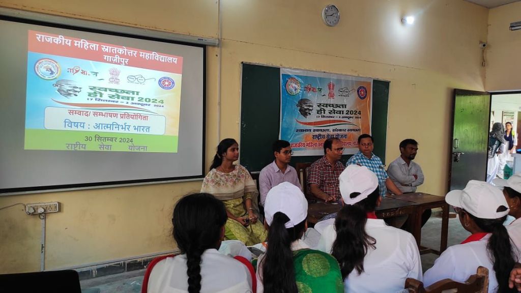 प्रतियोगिता के परिणाम की घोषण प्राचार्य प्रोफेसर डॉ अनीता कुमारी ने की । निर्णायक मंडल में महाविद्यालय के प्राध्यापक प्रो. उमाशंकर प्रसाद, डॉ. हरेंद्र यादव व डॉ. पीयूष सिंह रहे। तत्पश्चात इसी क्रम में शासन के निर्देशानुसार प्रधानमंत्री नरेंद्र मोदी की महत्वाकांक्षी योजना “आत्मनिर्भर भारत” विषय पर संवाद/ संभाषण प्रतियोगिता का आयोजन किया गया जिसमें राष्ट्रीय सेवा योजना की स्वयंसेवी छात्राओं ने संबंधित विषय पर अपने विचार प्रस्तुत किये । इस अवसर पर वरिष्ठ कार्यक्रम अधिकारी डॉ अमित यादव, कार्यक्रम अधिकारी डा.गजनफर सईद, डॉ. रामनाथ, एवं डॉ ओम शिवानी, महाविद्यालय के प्राध्यापक डॉ. निरंजन कुमार, डॉ.शिव कुमार सहित राष्ट्रीय सेवा योजना की छात्राएं उपस्थित रहीं ।