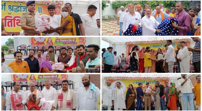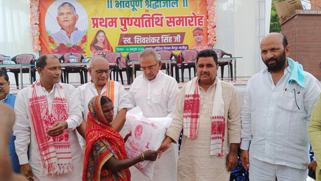 गाजीपुर। समाजसेवी, अहिरौली गांव के पूर्व ग्राम प्रधान एवं प्रमुख व्यवसाई शिवशंकर सिंह की प्रथम पुण्यतिथि नगर स्थित उनके आवास कौशिक सदन में मनाई गई। स्व सिंह को श्रद्धांजलि अर्पित करने के लिए जिले के गैर जनपद से लोग आएं एवं उनके चित्र के समक्ष पुष्प अर्पित किया। स्व सिंह की याद में उनके पुत्र जिला पंचायत अध्यक्ष प्रतिनिधि पंकज सिंह चंचल द्वारा गरीबों एवं असहायों में कंबल, साड़ी, ट्राई साईकिल, सिलाई मशीन एवं पौधे का वितरण किया गया। इसके बाद जरूरतमंदों के चेहरे खिल उठे।