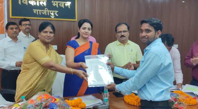 गाजीपुर।उत्तर प्रदेश अधीनस्थ सेवा चयन आयोग द्वारा ग्राम विकास अधिकारी (स०क०) के पद पर चयनित अभ्यर्थियों को गुरुवार को विकास भवन सभागार में नियुक्ति पत्र वितरण का आयोजन किया गया। जिसमें जनपद के सम्मानित जनप्रतिनिधि में जिला पंचायत अध्यक्ष सपना सिंह और नगरपालिका अध्यक्ष सरिता अग्रवाल मुख्य अतिथि के रूप में उपस्थित रहीं।जिला स्तरीय अधिकारियों में मुख्य विकास अधिकारी, जिला विकास अधिकारी, जिला समाज कल्याण अधिकारी, जिला दिव्यांगजन एवं सशक्तीकरण अधिकारी, जिला पिछड़ा वर्ग कल्याण अधिकारी व जिला प्रोबेशन अधिकारी, पशु चिकित्साधिकारी, उपस्थित रहे। गाजीपुर के कुल 08 नवचयनित ग्राम विकास अधिकारी(स०क०) में से केवल 07 नवचयनित ग्राम विकास अधिकारी (स०क०) नियुक्ति पत्र प्राप्त करने के लिए उपस्थित थे। 24-10-2024 को ही मुख्यमंत्री उत्तर प्रदेश के द्वारा प्रदेश में नवचयनित अभ्यर्थियों को लोक भवन स्थित सभागार, लखनऊ नियुक्ति पत्र वितरण का आयोजन किया गया है। उसी क्रम में जनपद के कुल 07 चयनित अभ्यर्थियों को जनपद स्तर से नियुक्ति पत्र वितरित किया गया है। चयनित अभ्यर्थियों में अरविन्द गुप्ता पुत्र ओमप्रकाश गुप्ता, दिव्यांश राय पुत्र सुरेन्द्र प्रसाद राय, पियूष कुमार दूबे पुत्र कन्हैया लाल दूबे, शशिबाला पुत्री संतूराम, रणवीर शास्त्री पुत्र श्रीराम शास्त्री, दिलीप कुमार पुत्र सुरेश चन्द्र, संतोष कुमार कुशवाहा पुत्र जयनारायण सिंह कुशवाहा लोगो द्वारा नियुक्ति पत्र प्राप्त किया गया है। चयनित अभ्यर्थियों को जनप्रतिनिधियों व जनपद स्तरीय अधिकारियों द्वारा शुभकामनाओं और सत्यनिष्ठा से कार्य करने हेतु प्रेरित किया गया।