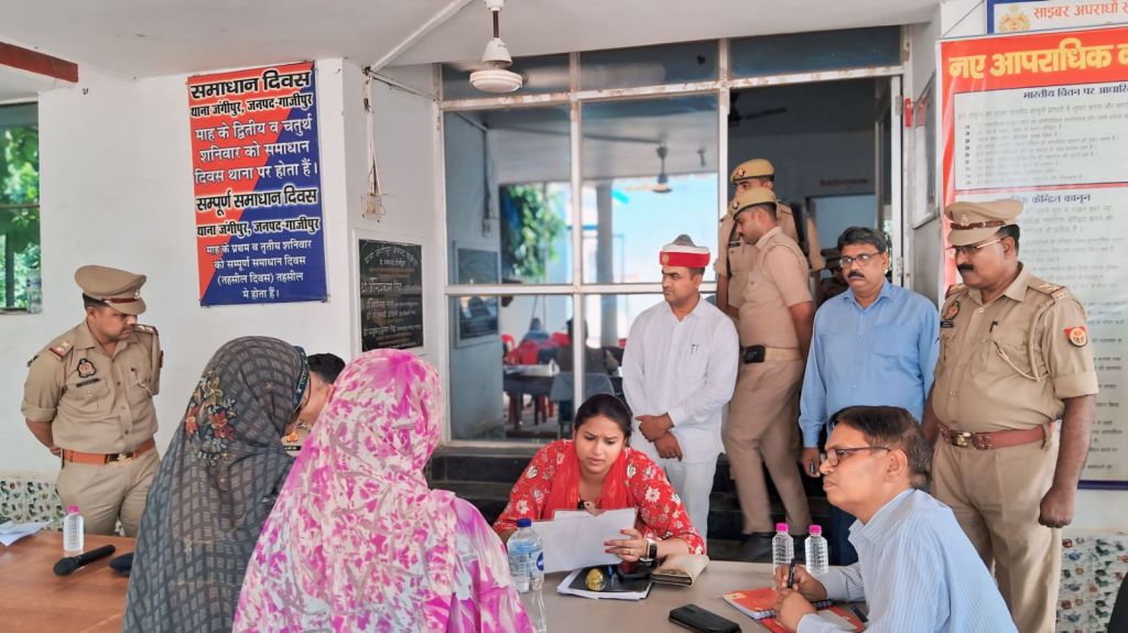गाजीपुर। शासन के निर्देश पर आज चतुर्थ शनिवार को थाना दिवस के अवसर पर जिलाधिकारी आर्यका अखौरी एवं पुलिस अधीक्षक डा0 ईरज राजा की अध्यक्षता में थाना जंगीपुर में उपस्थित फरियादियों की फरियाद सुनी गई साथ ही शिकायतो को जल्द से जल्द निस्तारण के लिए प्रशासनिक एवं पुलिस अधिकारियों को निर्देश दिया गया। थाना दिवस पर जंगीपुर मे 10 फरियादियों ने अपनी-अपनी शिकायतो को लिखित रूप में दिया जिसमें मौके पर 03 का निस्तारण किया गया एवं शेष निस्तारण हेतु सम्बन्धित अधिकारी को निर्देश दिया गया।