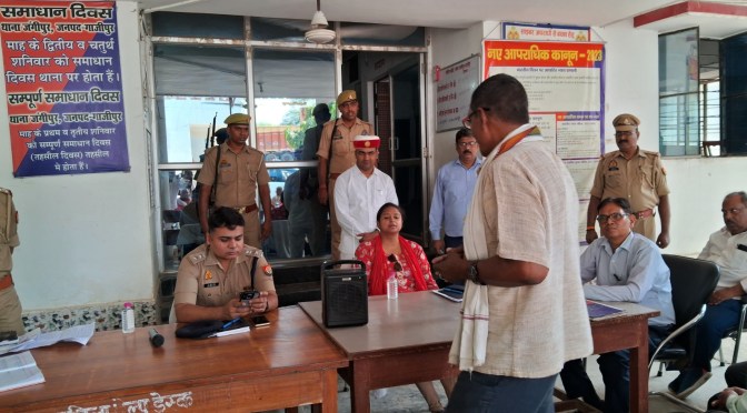 गाजीपुर। शासन के निर्देश पर आज चतुर्थ शनिवार को थाना दिवस के अवसर पर जिलाधिकारी आर्यका अखौरी एवं पुलिस अधीक्षक डा0 ईरज राजा की अध्यक्षता में थाना जंगीपुर में उपस्थित फरियादियों की फरियाद सुनी गई साथ ही शिकायतो को जल्द से जल्द निस्तारण के लिए प्रशासनिक एवं पुलिस अधिकारियों को निर्देश दिया गया। थाना दिवस पर जंगीपुर मे 10 फरियादियों ने अपनी-अपनी शिकायतो को लिखित रूप में दिया जिसमें मौके पर 03 का निस्तारण किया गया एवं शेष निस्तारण हेतु सम्बन्धित अधिकारी को निर्देश दिया गया।