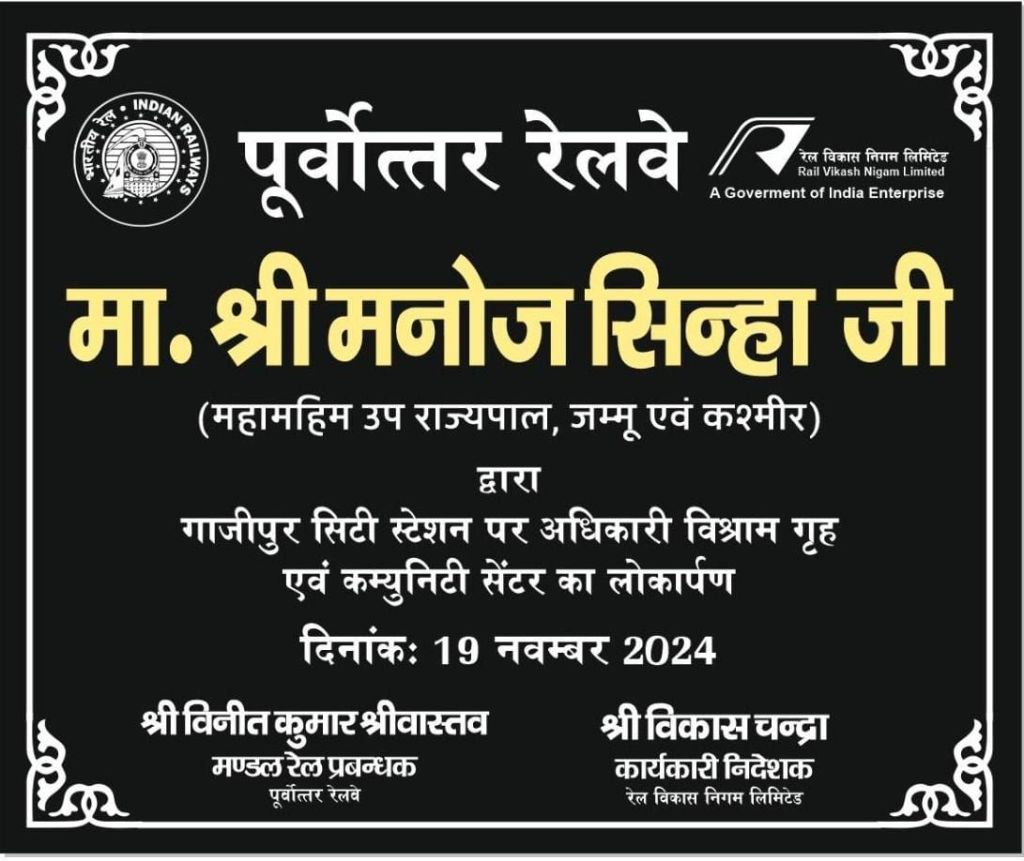 गाजीपुर। गाजीपुर सिटी स्टेशन पर स्थित अधिकारी विश्राम गृह एवं कम्युनिटी सेंटर का लोकार्पण 19 नवंबर को जम्मू कश्मीर के उपराज्यपाल मनोज सिन्हा के द्वारा होगा। इसका शिलान्यास 27 मई 2017 को हुआ था। रेल विकास निगम लिमिटेड के मुख्य परियोजना प्रबंधक आशुतोष शुक्ला ने भाजपा सोशल मीडिया के जिला संयोजक कार्तिक गुप्ता के माध्यम से बताया कि रेलवे के अधिकारियों के विश्राम के लिए तथा मीटिंग के लिए अधिकारी विश्राम गृह और कम्युनिटी सेंटर (कांफ्रेंस हॉल) का शिलान्यास तत्कालीन संचार राज्यमंत्री स्वतंत्र प्रभार एवं रेल राज्यमंत्री मनोज सिन्हा के द्वारा 27 मई 2017 को किया गया था। जिसका निर्माण लगभग 4 करोड़ की लागत से पूर्ण किया गया।