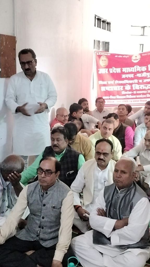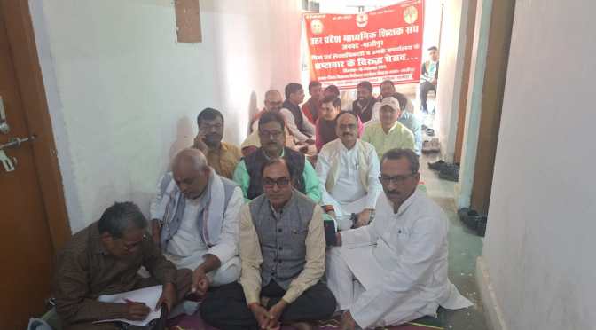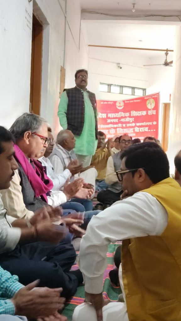 इससे शिक्षकों में आक्रोश व्याप्त है। भ्रष्टाचार पर नियंत्रण न होने पर शिक्षक आंदोलन करने को विवश है।उन्होंने कहा कि संगठन इन समस्याओं के निराकरण के लिए काफी समय से संघर्षरत है। अगर इनका शीघ्र निदान नहीं किया गया तो शिक्षक बोर्ड परीक्षा कार्य को प्रभावित व ठप करने को मजबूर होंगे। इसकी पूर्ण जिम्मेदारी माध्यमिक शिक्षा विभाग की होगी। कहा कि एक सप्ताह पूर्व विभिन्न समस्याओं को लेकर डीएम से शिक्षकों का प्रतिनिधिमंडल मिला था। तब जिलाधिकारी ने जिला विद्यालय निरीक्षक को मोबाइल से इसके सम्बन्ध में निर्देश भी दिया एवं समस्याओं के शीघ्र निस्तारण का आदेश भी दिया। उसके बाद भी शिक्षक संघ को घेराव के लिए बाध्य होना पड़ा। वक्ताओं में मुख्य रूप से शिव कुमार सिंह, नारायण उपाध्याय, सौरभ कुमार पाण्डेय, राणाप्रताप सिंह, प्रकाश चन्द्र दुबे, अमित कुमार राय, रत्नेश कुमार राय, विवेका नन्द गिरी, शैलेन्द्र सिंह यादव, अखिलानन्द पांडेय, सूर्यप्रकाश राय, डा. रेयाज खां, मनोज विश्वकर्मा, अविनाश गौतम आदि मौजूद रहे। धरने की अध्यक्षता चौधरी दिनेश चन्द राय ने किया।
