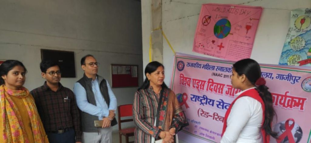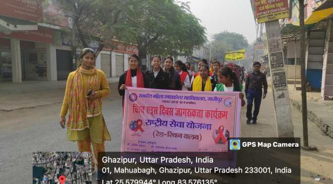 गाजीपुर। रविवार को राजकीय महिला स्नातकोत्तर महाविद्यालय के रेड रिबन क्लब द्वारा विश्व एड्स दिवस के अवसर पर जागरूकता रैली एवं पोस्टर प्रदर्शनी का आयोजन किया गया। रासेयो की स्वयंसेवी छात्राओं द्वारा एक रैली निकाली गई । प्राचार्य डा अनिता कुमारी द्वारा रैली को हरी झंडी दिखाकर रवाना किया गया । रैली के दौरान छात्राओं द्वारा एड्स जागरूकता संबंधी तमाम नारे जैसे – जन-जन ने ठाना है विश्व से एड्स मिटाना है, एड्स है जानलेवा बीमारी इसे मिटाना हम सब की जिम्मेदारी – आदि लगाकर लोगों को जागरूक किया गया। महुआ बाग मिश्र बाजार कोतवाली होते हुए महाविद्यालय लौटकर छात्राओं ने सूक्ष्म जलपान किया ।
