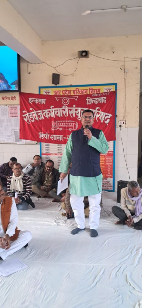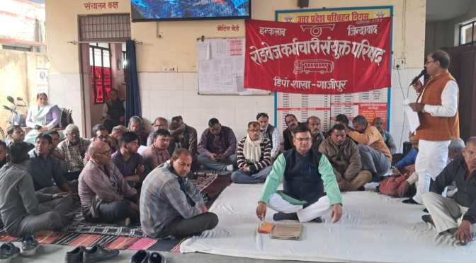 गाजीपुर। रोडवेज कर्मचारी संयुक्त परिषद के प्रांतीय आवाहन पर जनपद शाखा परिवहन निगम के डिपो में गुरुवार को अरविंद कुमार सिंह के अध्यक्षता में एक दिवसीय धरना प्रदर्शन संपन्न हुआ, जिसमें राष्ट्रीयकृत मांगों पर निजी बसों के अवैध व अनधिकृत संचालन, छोटी बड़ी गाड़ियों से अनियमित के विरोध एवं निगम संपत्तियों को निजी हाथों में सौपने तथा निगम के कार्यशालाओं का प्राइवेटाइजेशन करने के विरोध में कर्मचारी रहे। जिसमें रोडवेज कर्मचारी संयुक्त परिषद के जिला अध्यक्ष अरविंद कुमार सिंह द्वारा उद्बोधन में कहा गया कि सरकार अपने हटवादिता से पीछे नहीं हटती है तो आने वाले समय में रोडवेज का एक भी चक्का रोडवेज परिसर से नहीं हिलेगा, जिससे जनमानस को परेशानियों का सामना करना पड़ेगा। जिसकी संपूर्ण जिम्मेदारी उत्तर प्रदेश सरकार की होगी।