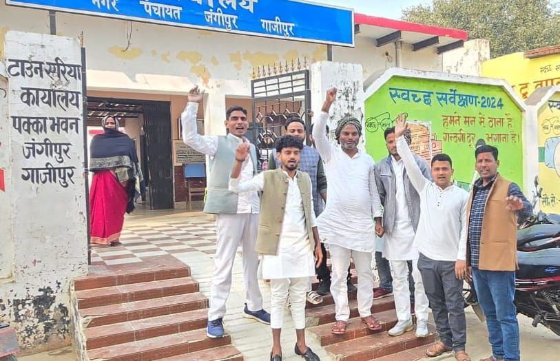 गाजीपुर। सोमवार को नगर पंचायत जंगीपुर के ग्यारह सभासदों मे दस सभासदों ने नगर में हो रहे घटिया नाला निर्माण व जल जमाव की समस्या को लेकर चेयरमैन रुखसाना परवीन व उनके पति प्रतिनिधि अशरफ अली के खिलाफ मोर्चा खोल दिया। वार्ड नंबर दो अम्बेडकर नगर के सभासद प्रतिनिधि दिवाकर प्रसाद के नेतृत्व में नाराज सभासदों ने नगर पंचायत कार्यालय पर पहुँचकर अधिशासी अधिकारी अजय कुमार गुप्ता से नगर में हो रहे नाले निर्माण का स्टीमेंट माँगा। इस पर अधिशासी अधिकारी ने बिना चेयरमैन की अनुमति के स्टीमेंट देने से सभासदों को साफ मना कर दिया।