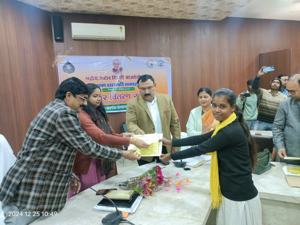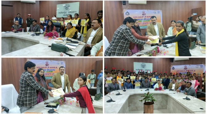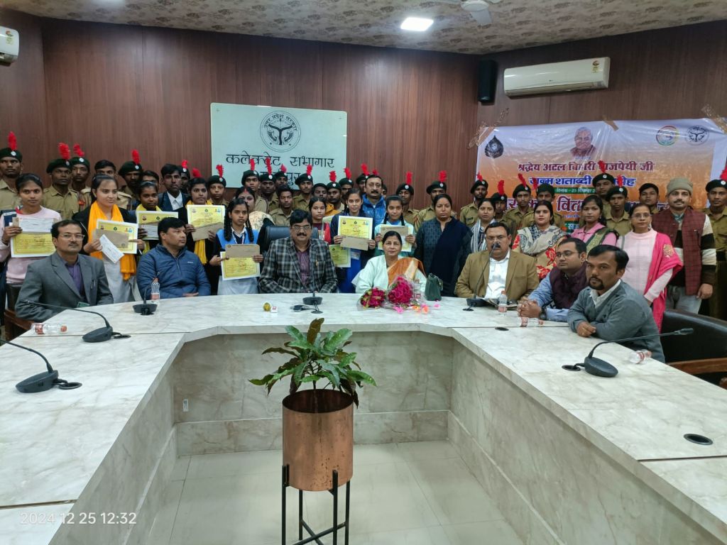 गाजीपुर। बुधवार को राइफल क्लब सभागार में भारत रत्न अटल बिहारी वाजपेई के जन्मशताब्दी वर्ष में आयोजित प्रतियोगिताओं के पुरस्कार वितरण समारोह में जिलाधिकारी आर्यका अखौरी द्वारा विजेता प्रतिभागियों को प्रमाण पत्र एवं पुरस्कार राशि का चेक वितरित किया गया। जिसमें राजकीय महाविद्यालय की छात्राओं ने बाजी मारी। भाषण प्रतियोगिता में प्रथम स्थान- अंजली वर्मा पुत्री, द्वितीय स्थान- संध्या राजभर, तृतीय स्थान- अमृता राय ने प्राप्त किया।