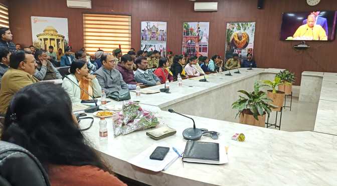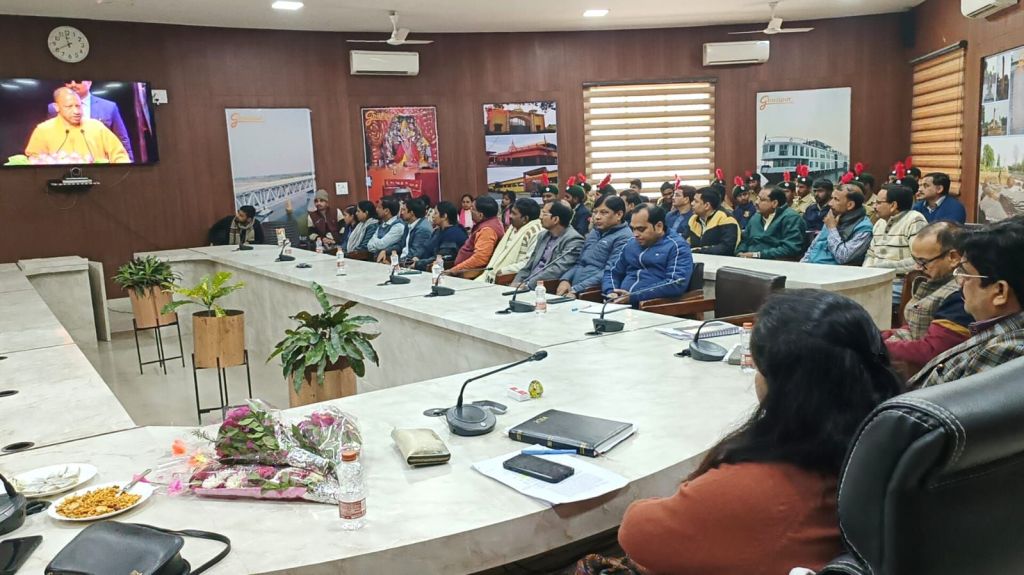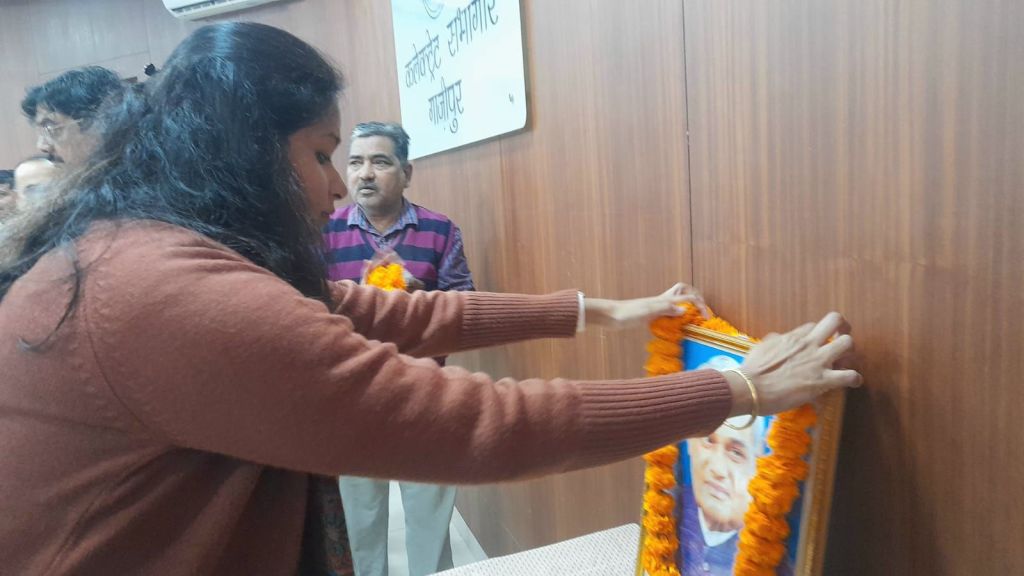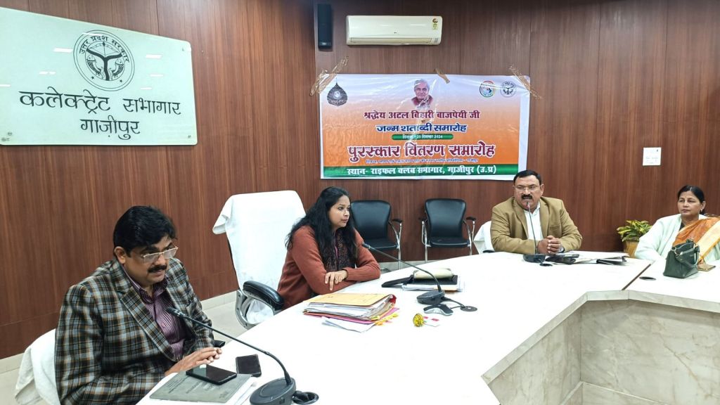 गाज़ीपुर। लखनऊ स्थित लोक भवन में आयोजित भारत रत्न अटल बिहारी वाजपेई के जन्म शताब्दी समारोह के अवसर पर उत्तर प्रदेश में सुशासन विषयक संगोष्ठी का शुभारंभ रक्षा मंत्री भारत सरकार राजनाथ सिंह एवं मुख्यमंत्री योगी आदित्यनाथ द्वारा किया गया। इस विशेष कार्यक्रम का सजीव प्रसारण जिले के कलेक्ट्रेट सभागार में जिलाधिकारी आर्यका अखौरी की अध्यक्षता एवं अध्यक्ष नगर पालिका परिषद सरिता अग्रवाल की उपस्थिति में बुधवार को देखा व सुना गया। कार्यक्रम के दौरान जिलाधिकारी आर्यका अखौरी, परियोजना निदेशक राजेश यादव, जिला विद्यालय निरीक्षक भाष्कर मिश्रा एवं अन्य संबंधित अधिकारियों ने भारत रत्न अटल बिहारी वाजपेई के चित्र पर माल्यार्पण कर श्रद्धांजलि अर्पित की।