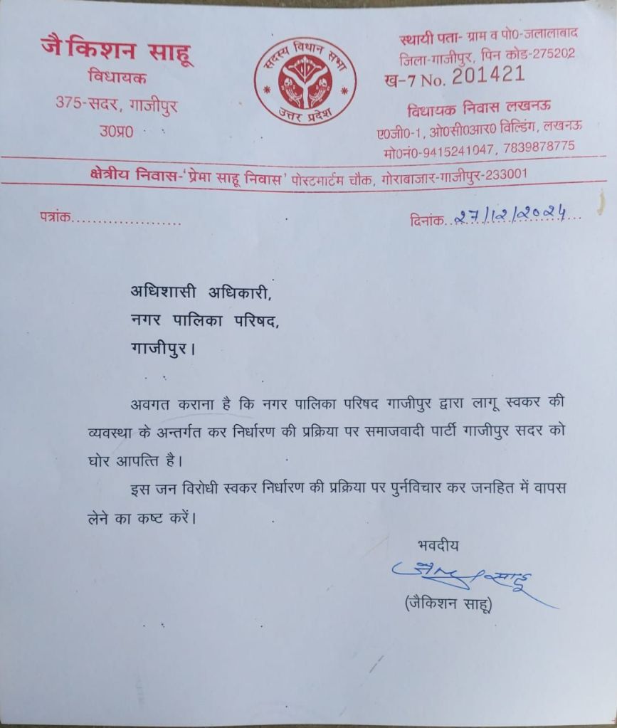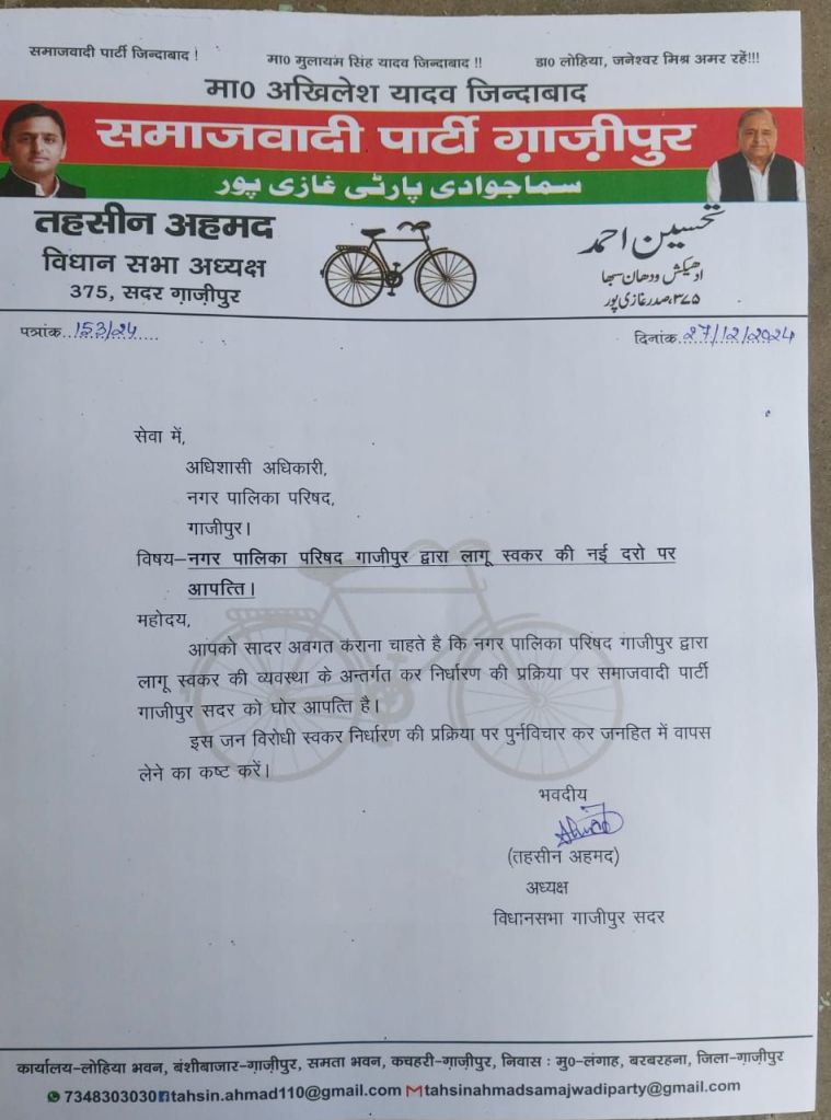 गाजीपुर। समाजवादी पार्टी के सदर विधायक जै किशन साहू और सदर विधानसभा अध्यक्ष तहसीन अहमद ने शुक्रवार को नए स्वकर प्रणाली को लेकर अधिशासी अधिकारी अमिता अरुण को पत्रक सौंप आपत्ति दर्ज कराई। पत्रक के माध्यम से सदर विधायक ने कहा कि नगर पालिका परिषद गाजीपुर द्वारा लागू स्वकर की व्यवस्था के अन्तर्गत कर निर्धारण की प्रक्रिया पर समाजवादी पार्टी को घोर आपत्ति है।