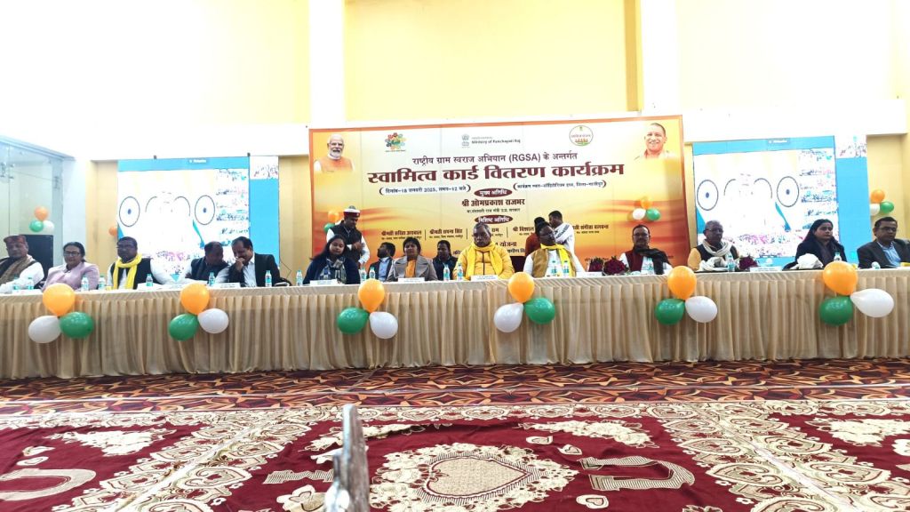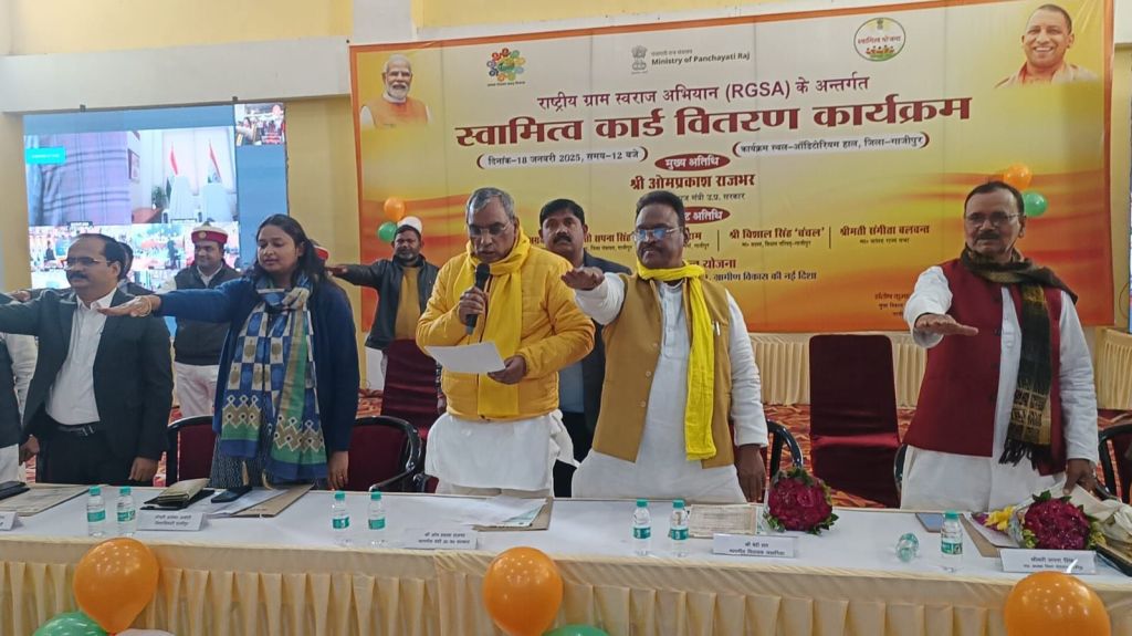 गाजीपुर। स्वामित्व योजना अंतर्गत घरौनी वितरण कार्यक्रम जनपद स्तर पर ऑडिटोरियम सभागार निकट विकास भवन मे शनिवार को संपन्न हुआ। कार्यक्रम में सर्वप्रथम प्रधानमंत्री व मुख्यमंत्री की अध्यक्षता में आयोजित कार्यक्रम के लाइव प्रसारण को जनप्रतिनिधियों, जिलाधिकारी, घरौनी के लाभार्थियों एवं ग्रामीण के द्वारा देखा एवं सुना गया। स्वामित्व योजना के तहत प्रधानमंत्री नरेंद्र मोदी द्वारा देश भर के लगभग 50 हजार गांव में 65 लाख प्रॉपर्टी कार्ड का डिजिटल वितरण किया गया। इसके अलावा इस योजना के लाभार्थियों के साथ उन्होंने सीधा संवाद भी किया।